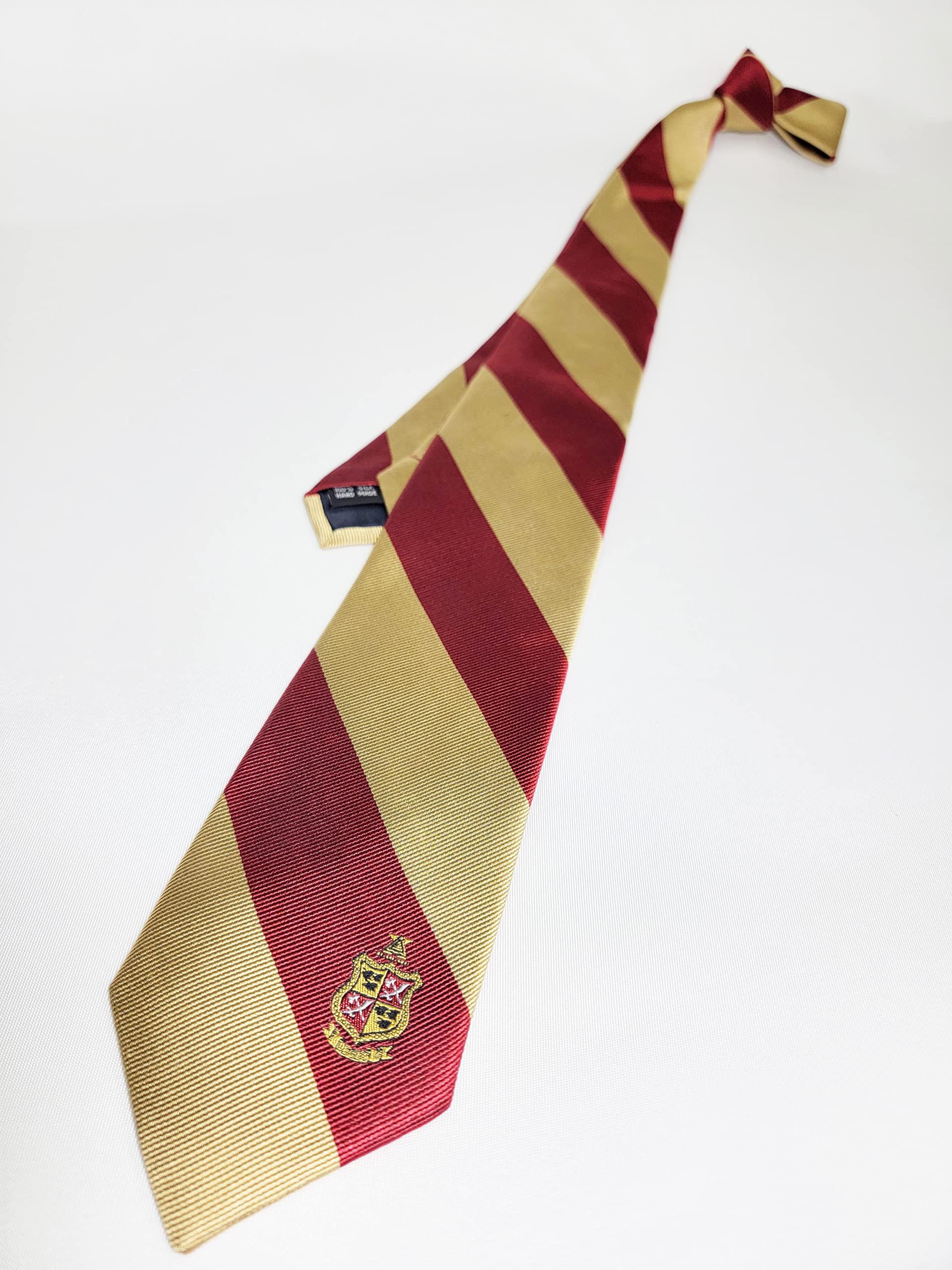 Delta Chi striped tie with fraternity crest. Colors are based on fraternity colors.