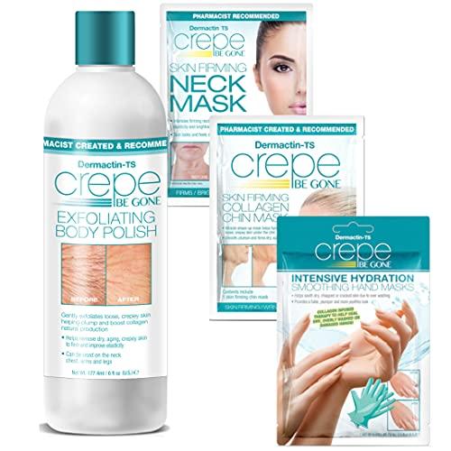 - This deluxe 4-Piece set includes our Crepe Be Gone Exfoliating Body Polish 4oz, our Skin Firming Neck Mask, our Firming Chin Mask AND our Intense Hydration Smoothing Hand Mask.