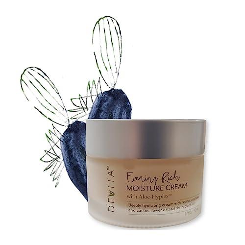 Wake up to fresh, radiant, youthful-looking skin naturally. DeVita\'s Evening Rich Moisture Cream works overnight to deeply replenish the skin with long-lasting hydration while minimizing the signs of aging. This ultra-rich moisturizer features a proprietary tripeptide complex to help support skin\'s natural production of collagen and elastin for firm, more youthful-looking result while you sleep. Also contains retinol to help improve the appearance of fines lines, wrinkles and pores for an undeniably rested, restored complexion. Palmitoyl Tripeptide-5: A patented, synthetic tripeptide designed to help protect again collagen breakdown while supporting skin\'s natural collagen production. Helps improve the appearance of wrinkles, provides a more lifted appearance, and refines the look of pores. Retinol (Vitamin A): It is a skin-restoring, wrinkle-smoothing, firming ingredient and an antioxidant, allowing it to improve a variety of skin concerns, most related to visible signs of aging. Hyaluronic Acid (Sodium Hyaluronate): A potent hydrator that contains high and low molecular weight hyaluronic acids that replenish the epidermis and the dermis. HA attracts and retains over 1,000 times its weight in water within the cells of skin, making it an excellent moisturizer. Cereus Grandiflorus (Cactus) Flower Extract: Cactus flower rich in antioxidants that has astringent properties to help promote cellular renewal, helping skin appear energized and refreshed. Plukenetia Volubilis Seed Oil: Contains one of the highest concentrations of polyunsaturated fatty acids among all the oily seeds used for human consumption. It reaches an average concentration of 48% content of alpha-linolenic acid (Omega 3) and an average of 37% linoleic acid (Omega 6). Additionally, it contains approximately 8% oleic acid (Omega 9).
