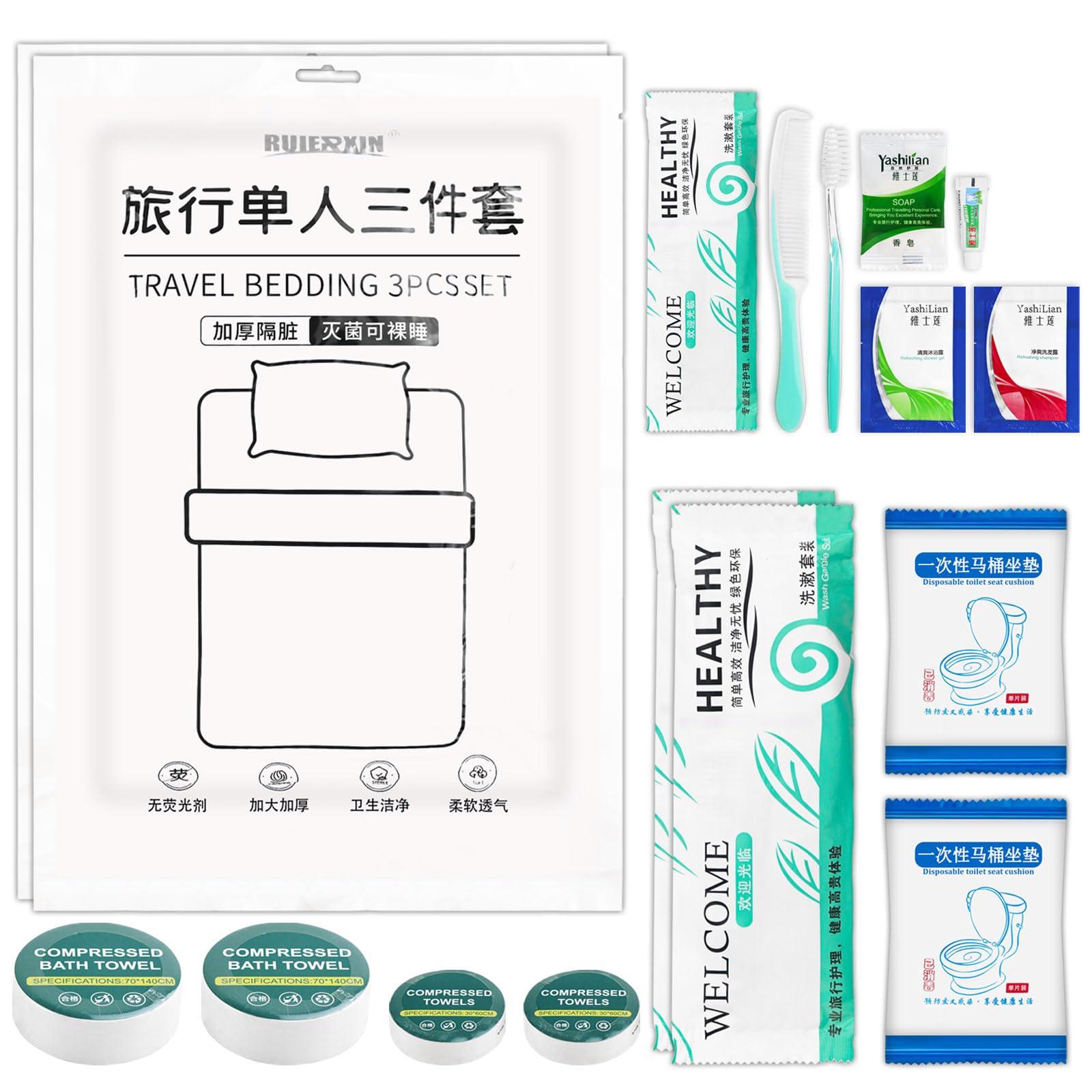 - Set includes: disposable sheet set with disposable sheets for travel x2, disposable quilt cover x2, disposable pillow case x2, disposable towels x2, disposable bath towels x2, disposable toilet seat x2, hygiene kit (disposable toothbrush x2+disposable toothpaste x2+soap x2+travel comb x2+hotel body wash and shampoo x2), the set has a complete range of products, perfect for traveling.