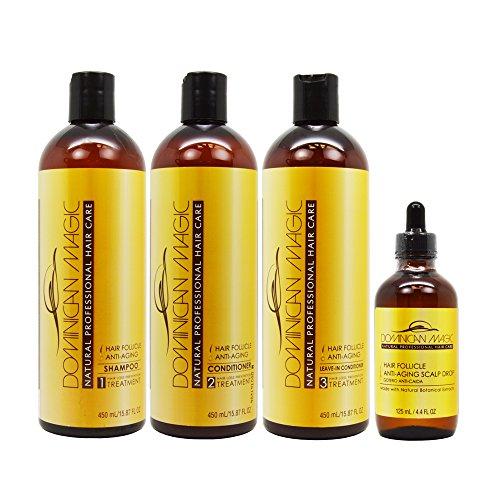 DOMINICAN MAGIC HAIR FOLLICLE ANTI-AGING COMBO KIT / COMBO DE ANTI-CAIDA 52oz DOMINICAN MAGIC HAIR FOLLICLE ANTI-AGING SHAMPOO 16oz Made with the best botanical extracts to repair, hydrate and condition dry, process and color treated hair Extracts from coconut, rosemary, aloe vera and jojoba are effective at the hair follicle and shaft restoration and therefore, prevents premature hair loss. DOMINICAN MAGIC HAIR FOLLICLE ANTI-AGING CONDITIONER 16oz Made with the best botanical extracts to repair, hydrate and condition dry, process and color treated hair Extracts from coconut, rosemary, aloe vera and jojoba are effective at the hair follicle and shaft restoration and therefore, prevents premature hair loss. DOMINICAN MAGIC HAIR FOLLICLE ANTI-AGING SMOOTHING BALM 16oz The best in smoothing all types of hair to create smooth curly or straight looks. Dominican Magic Smoothing Balm provides maximum smoothness and superior shine on straight and curly hair. DOMINICAN MAGIC HAIR FOLLICLE ANTI-AGING SCALP APPLICATOR 4.4oz Made with a natural botanical complex, this hair applicator is designed to increase the moisture and blood circulation of damaged or balding hair. It's natural ingredients will help to enhance the integrity of hair growth. Therefore, minimizing premature hair loss by slowing down the age process and strengthening the hair follicles.