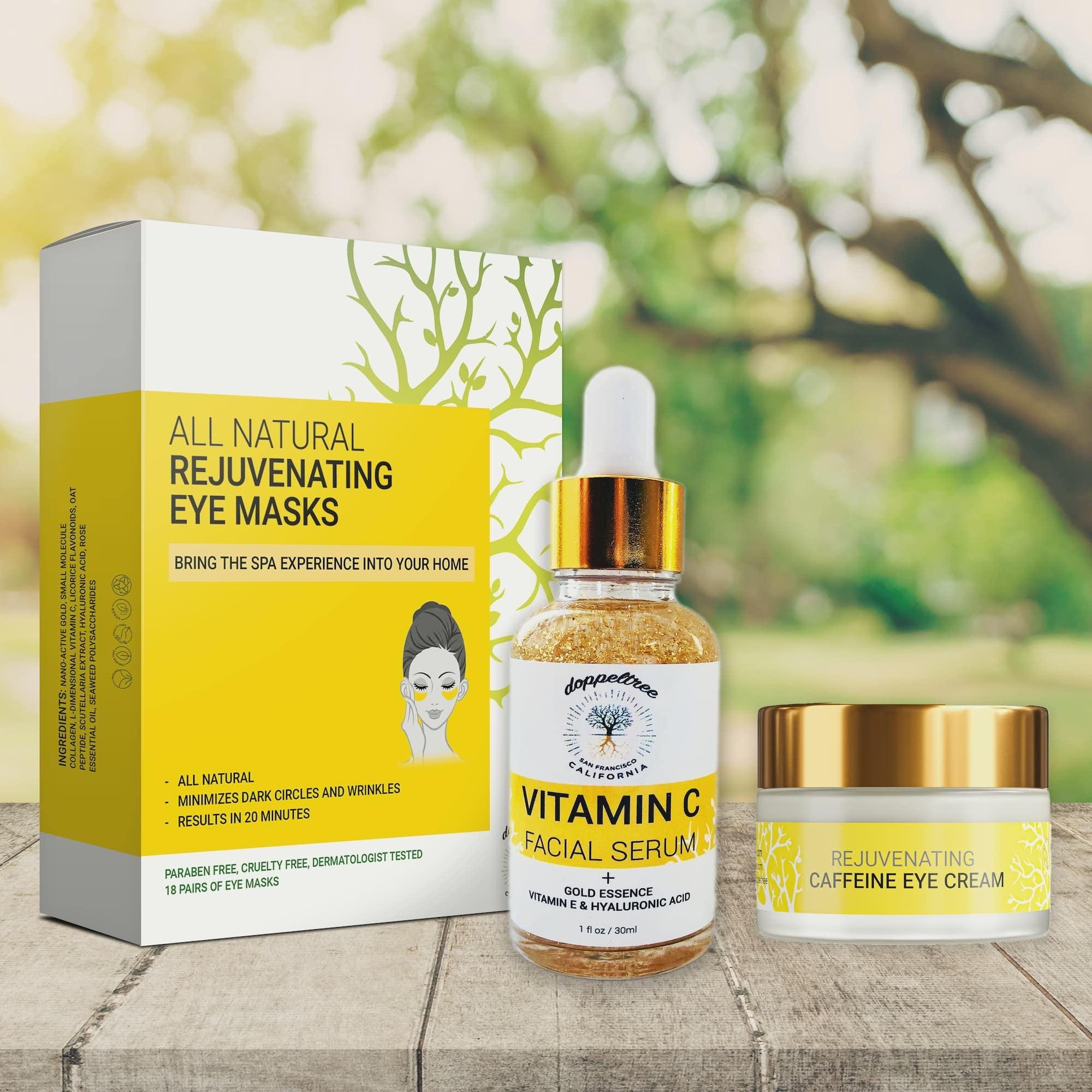 - Transform your skincare routine and rejuvenate your eye area with our "Radiant Eyes Revival" bundle, thoughtfully curated to target puffiness, dark circles, and signs of aging. This powerful trio includes Caffeine Eye Cream, Vitamin C Serum, and Gold Under Eye Masks for a comprehensive and luxurious eye care regimen.