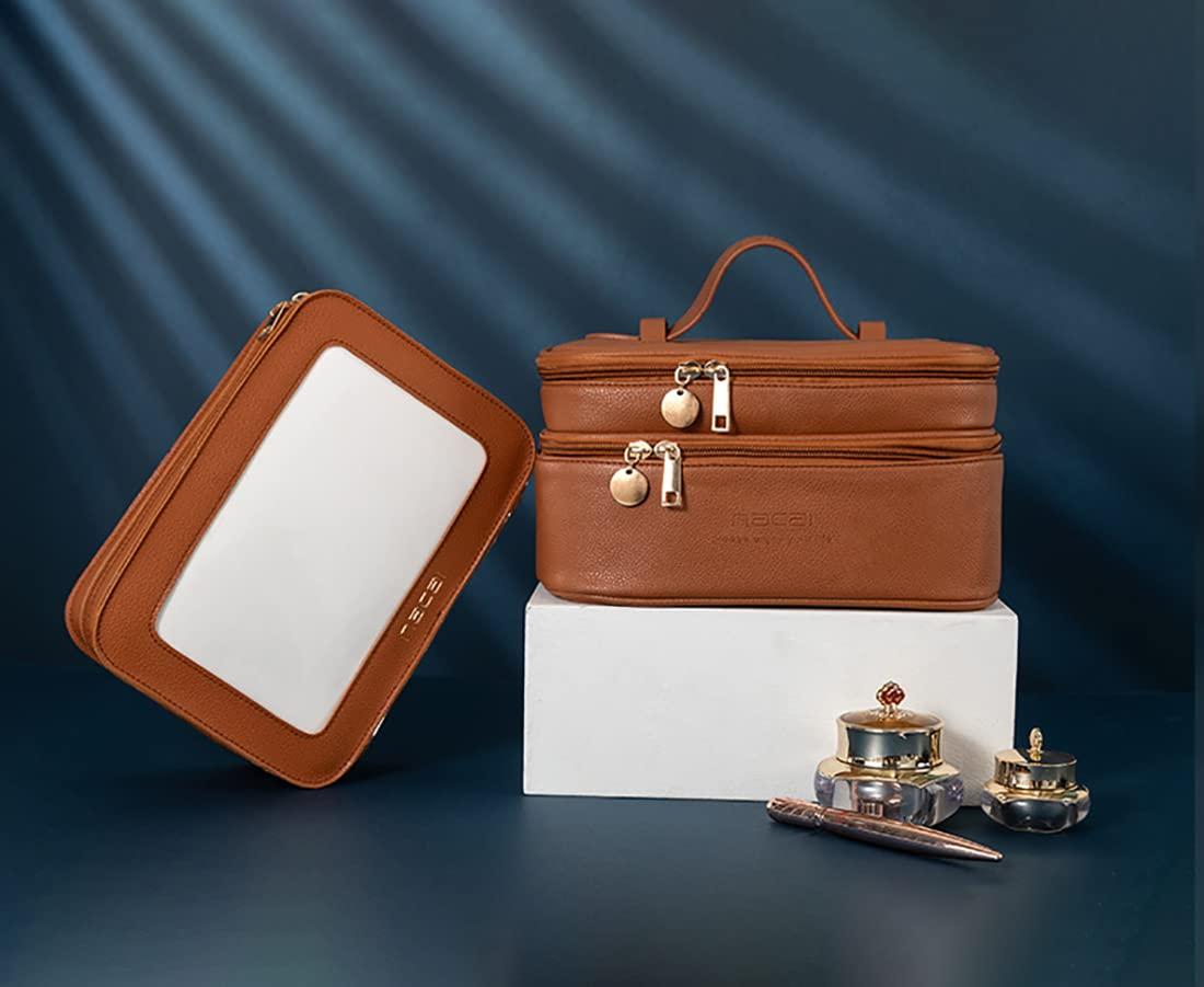 - LARGE CAPACITY: The Double layer makeup bags holds a lot, is great for trip, a more compact but spacious makeup bag. It definitely holds WAY more makeup/brushes due to the size but the deep inside and the extra space on top pocket really makes a difference