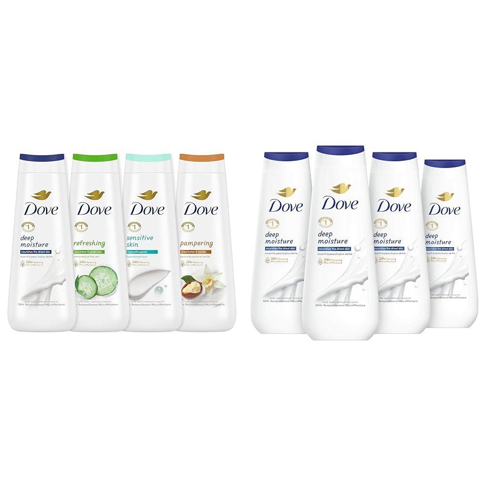 This Dove body wash bundle contains two collections of moisturizing and nourishing body washes to leave your skin feeling soft and renewed. The first collection includes four 20 oz body washes (Deep Moisture, Sensitive Skin, Cucumber and Green Tea, and Shea Butter and Vanilla) made with 24-hour Renewing MicroMoisture. These body washes contain millions of MicroMoisture droplets to actively regenerate skin's natural moisture. Deep Moisture body wash nourishes the driest skin, while Sensitive Skin soothes dryness with its hypoallergenic formula. The second collection includes four 20 oz Deep Moisture body washes formulated with plant-based moisturizers to gently cleanse and nourish skin's microbiome. Its millions of MicroMoisture droplets deeply moisturize the driest skin. Both collections are from Dove, the #1 dermatologist-recommended body wash brand. The body washes have a biodegradable formula and come packaged in 100% recycled plastic bottles. Together, these two complementary collections provide a complete skincare solution to cleanse skin while delivering deep, long-lasting moisture.