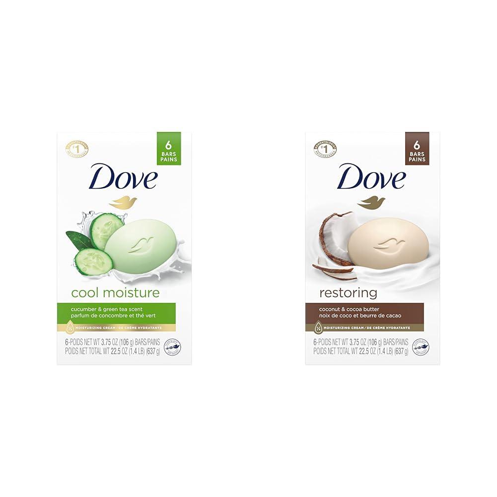 Refresh and restore your skin with this bundle of Dove Beauty Bars. It includes 6 bars of Dove Cool Moisture Beauty Bar that combines cucumber and green tea scents with gentle cleansers and moisturizing cream, leaving skin feeling refreshed and nourished. This dermatologist-recommended beauty bar is a versatile cleanser for face, body and hands that washes away dirt and germs without drying skin like ordinary bar soap. Also included are 6 bars of Dove Restoring Coconut Milk Beauty Bar that pampers skin with a rich, soothing lather. Its comforting coconut scent leaves you in a state of peaceful tranquility. With 14 moisturizing cream, both beauty bars help skin maintain its natural moisture barrier. Unlike ordinary bar soap, these bars leave skin feeling smoother and more radiant. Together these two beauty bars provide a complete experience - the Cool Moisture bars stimulate the senses while gently cleansing, and the Restoring Coconut Milk bars relax the body while nourishing the skin. Indulge yourself in this skin-loving self-care bundle.
