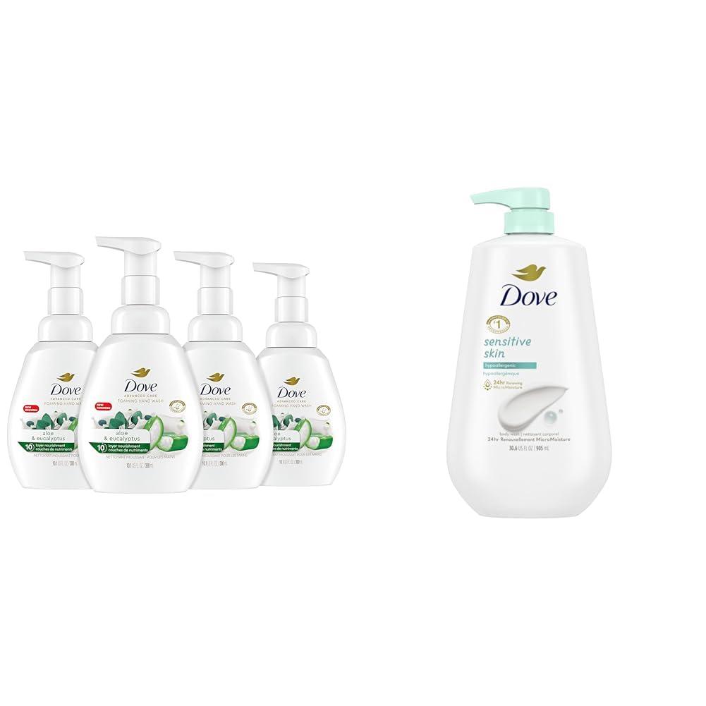 This Dove skincare bundle includes a pack of 4, 10.1 oz bottles of Dove Foaming Hand Wash with Aloe & Eucalyptus and one 30.6 oz bottle of Dove Body Wash for Sensitive Skin with pump. The foaming hand wash is formulated with Dove's Moisture Boost 5X Complex to deeply nourish skin on hands and remove germs, leaving hands soft and smooth. It is dermatologist-recommended, sulfate-free and packaged in 100% recycled bottles. The body wash is designed for sensitive skin with a hypoallergenic, sulfate-free formula containing plant-based moisturizers. It leaves skin renewed and healthy-looking for 24 hours with its 24hr Renewing MicroMoisture droplets. From the #1 dermatologist-recommended body wash brand, this body wash gently cleanses and nourishes. With complementary formulas focused on gentle cleansing and moisturization, these Dove products are thoughtfully made without sulfates or parabens and packaged sustainably. Together they provide a nourishing skincare routine for hands and body.
