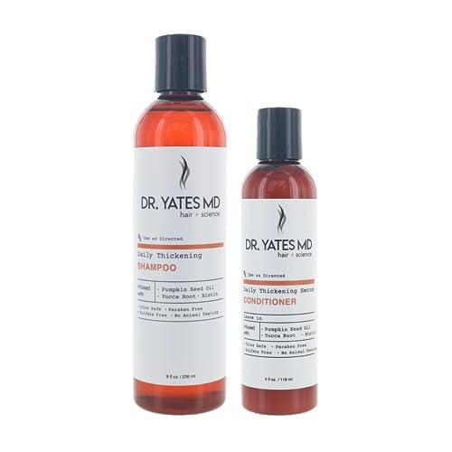 Shampoo- Is your shampoo making a thinning hair problem worse? Dr. Yates Thickening Shampoo is a daily volumizing cleanser for fine and thinning hair. Made with pumpkin seed oil, yucca root extract, and biotin, its formulated to thicken each hair strand and gently cleanse the scalp by removing residue and DHT build-up. The result is healthier, fuller-looking hair. For men and women. Directions: Apply into palm and rub hands together. Apply shampoo to wet hair, massaging scalp with fingertips in a rotating motion. Work lather through to ends. Rinse thoroughly and repeat if desired. Follow with Thickening Serum. Thickening Serum- Discover Dr. Yates most advanced serum everDr. Yates Thickening Serum, an intensive leave-in serum therapy for fine and thinning hair with the power to stimulate micro-circulation in the scalp to create healthy conditions for new hair growth. It nurtures the scalp and strengthens the hair with essential nutrients and compounds combined in a special formula specifically for fine and thinning hair. Use daily for optimal results. Thickening Serum is also great for styling hair and protecting hair from heat damage. For men and women. Directions: For best results shake before using. After washing with Dr. Yates MD shampoo, apply a dime size amount directly onto the scalp, section by section. Massage to distribute in thinning areas and hairline. Do not rinse. Style as usual.