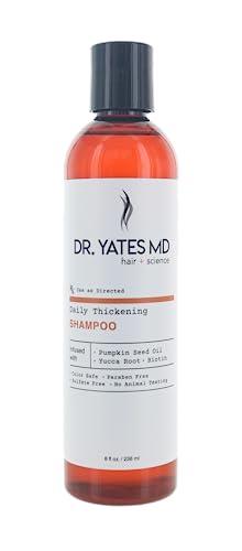 Say goodbye to limp, fine hair when you use Dr. Yates Thickening Shampoo every day. Most products weigh your hair down. When you use gel, spray, and heat on your hair every day, it starts to thin out, get stressed, and break. But Dr. Yates Thickening Shampoo can help reverse the effects of that stress, gently cleaning away chemical residue and coating each strand of hair with a natural moisturizer that both enriches and protects it. Dr. Yates Thickening Shampoo is a daily volumizing cleanser for fine and thinning hair. Made with pumpkin seed oil, yucca root extract, and biotin, its formulated to thicken each hair strand and gently cleanse the scalp by removing residue and DHT build-up. The result is healthier, fuller-looking hair. How does Dr. Yates Thickening Shampoo work? The natural ingredients in Dr. Yates Thickening Shampoo will transform your hair. The pumpkin seed oil in the shampoo is chock full of the essential vitamins, zinc and magnesium that are necessary for healthy hair. As a bonus, ingredients like zinc also thickens your hair and help it grow faster. Another ingredient in the shampoo is Yucca. Yucca has used by Native Americans for centuries to fight the effects of thinning hair, and it is full of vitamin C, potassium and saponins, proven to reduce inflammation. And the biotin in the shampoo works from the inside out to help improve your hair health naturally. For men and women. 8 Fl Oz. | use daily