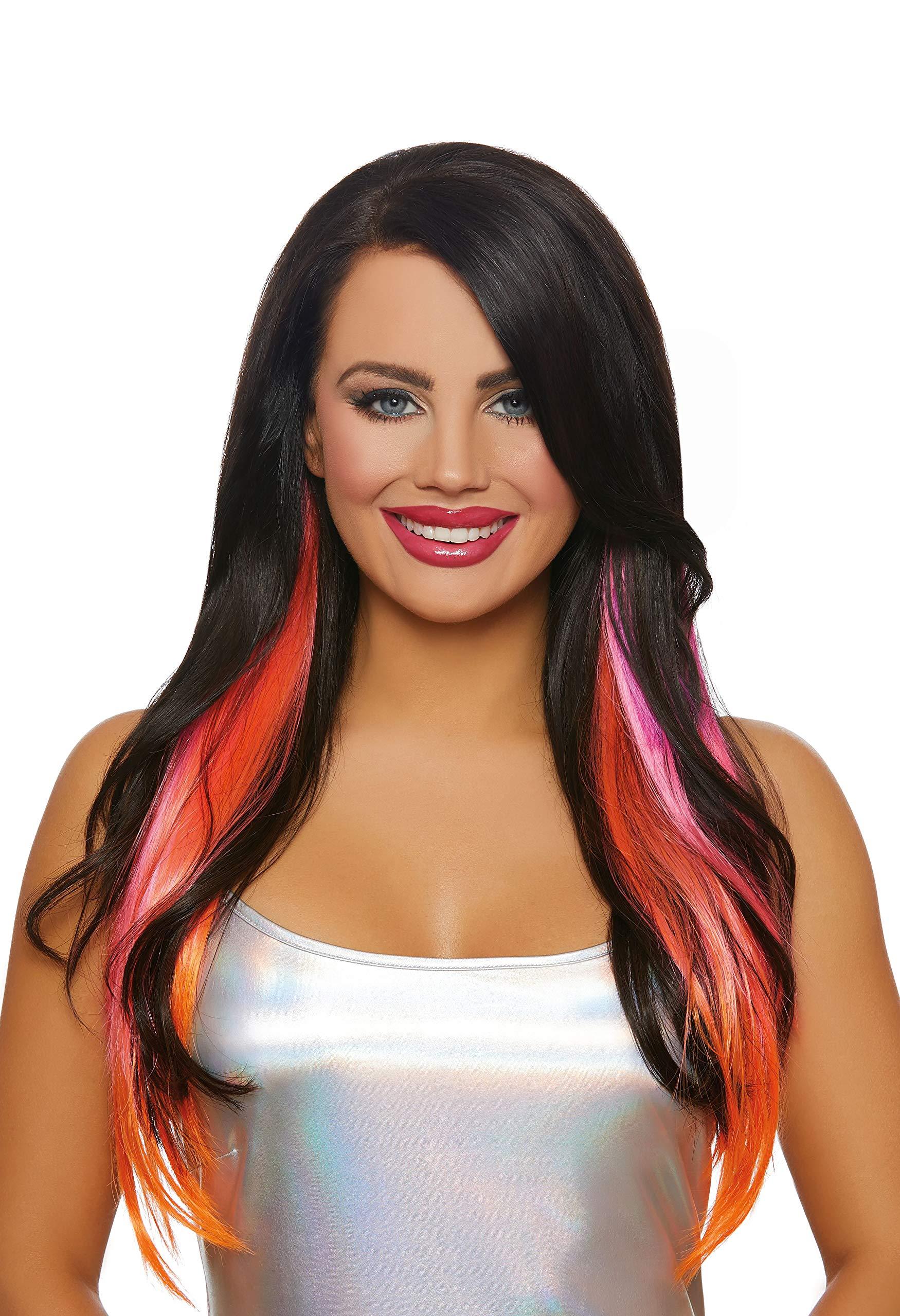 Long, straight layered hair extensions in magenta/neon pink/orange. Set comes with three 23 long clip-on pieces: one 9 center track and two 2 side tracks.