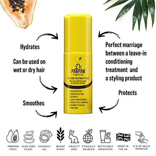 Multi-tasking hair treatment. Our award-winning Dr.PAWPAW It Does It All Hair Treatment Styler is a must-have in your hair routine. Combining 7 uses into one product, this spray can be used to reduce split ends, detangle hair, reduce frizz, add shine, as a heat protector, leave-in treatment and blowdry styler. Infused with our signature Mango & Coconut fragrance. Suitable for the whole family.