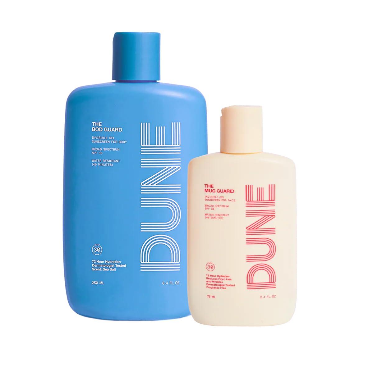 - DYNAMIC SUNSCREEN DUO: Get full face and body coverage with both DUNE Mug Guard and Bod Guard - the perfect dynamic duo. Mug Guard SPF 30 face sunscreen gel comes packed with skincare benefits for every mug, every day. Bod Guard's SPF 30 broad spectrum protection sunscreen protects skins appearance from the harsh sun with this refreshing sea salt scented sunscreen gel