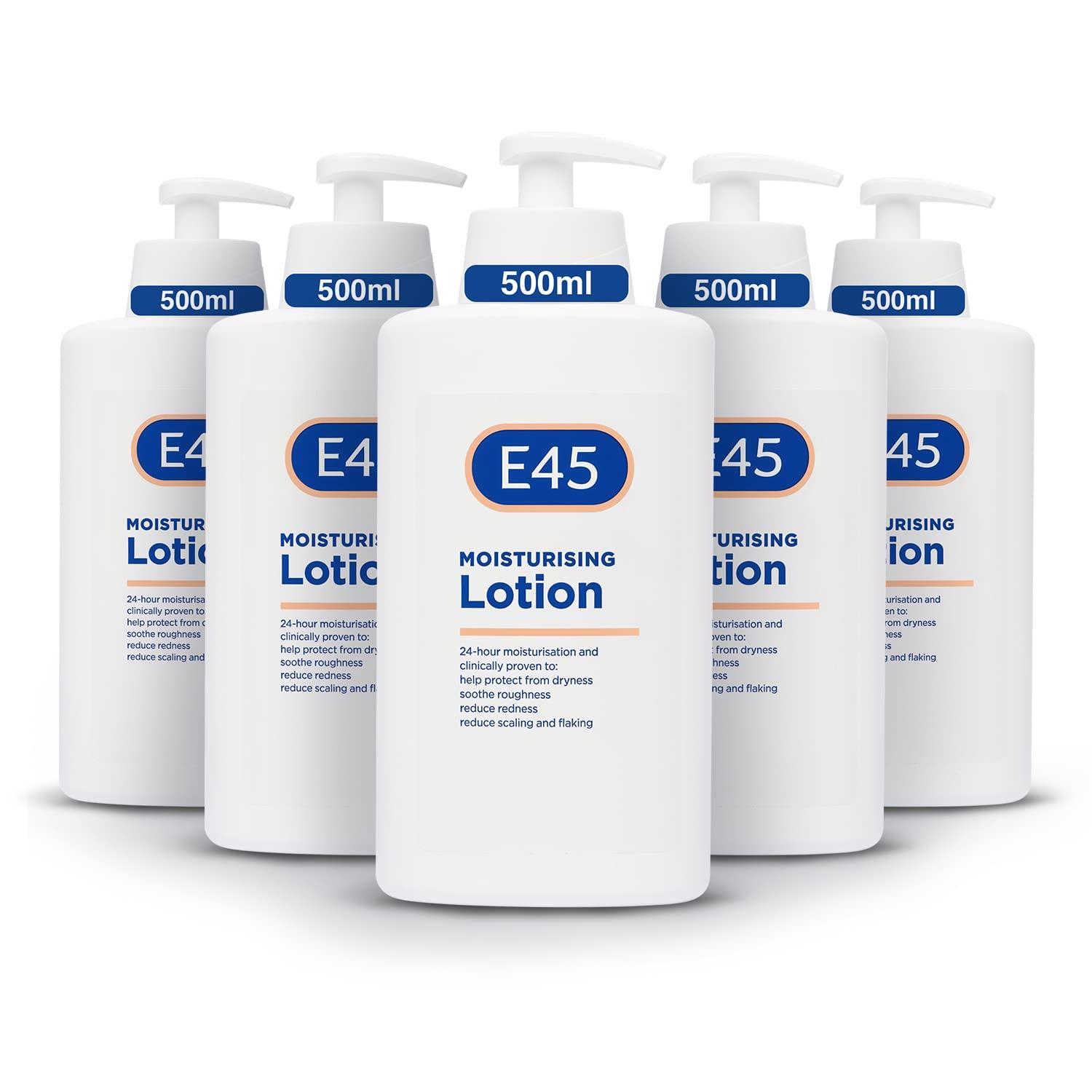 E45 Body Lotion 500 ml x5 Pack E45 Moisturising Lotion with Pump Daily Moisturiser for Long-Lasting Hydration for Dry Skin and Sensitive Skin Protect from Dryness, Reduce Redness and Flaking