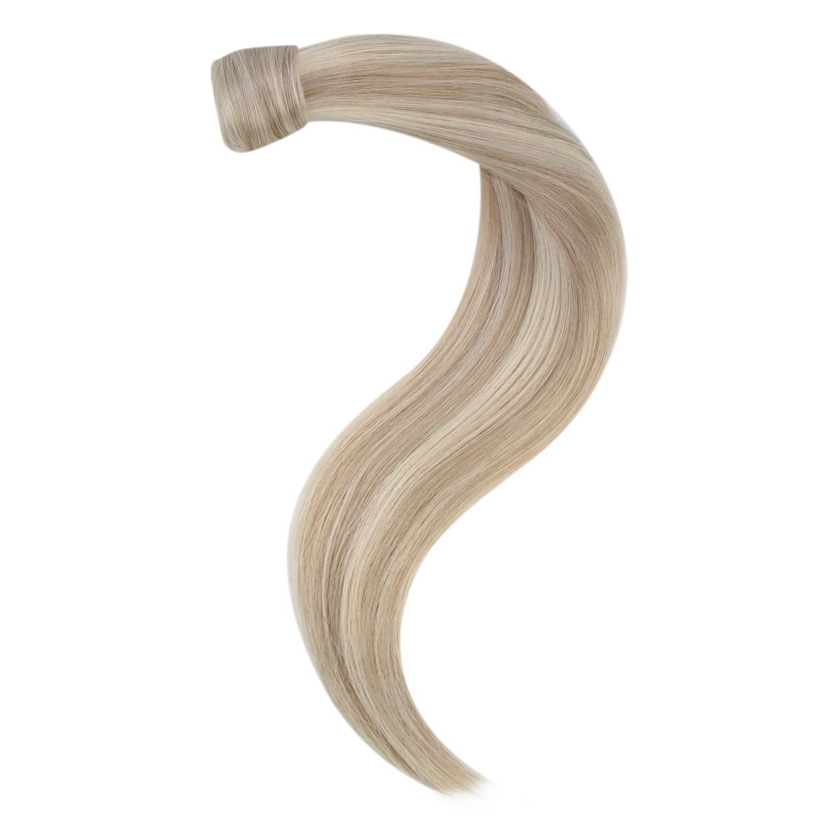 Ponytail Extensions Human Hair Blonde Human Hair Ponytail Ash Blonde Highlighted Bleach Blonde Pony Tails Hair Extensions Real Human Hair for Women 16Inch 80g #18P613