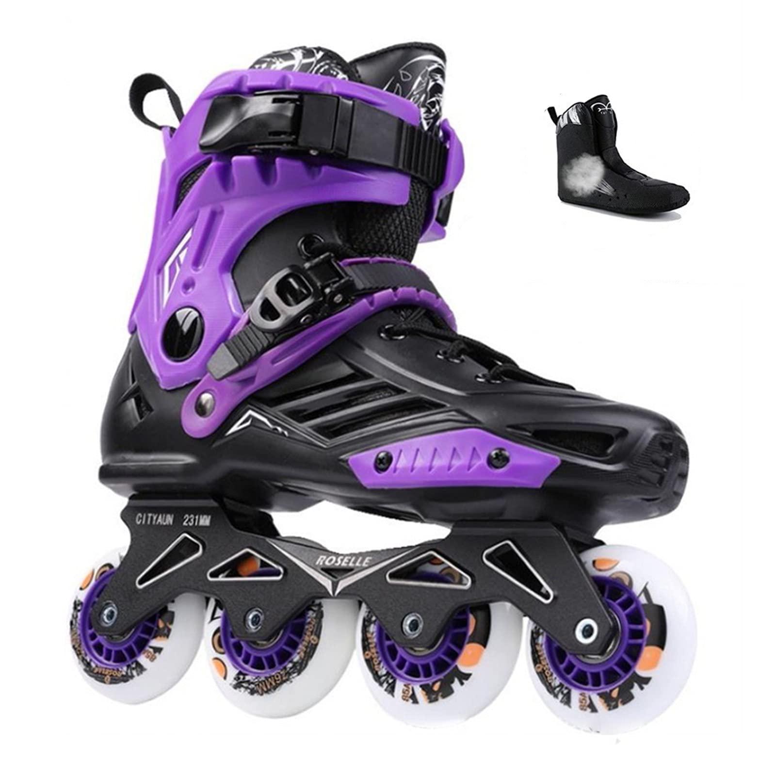 Men and Women Roller Skates Comfortable Roller Skates Inline Skates Classic Roller Skates for Girls and Boys Product category: roller skates Wheel type: single row Color: white, purple, black Inline wheel classification: Fancy shoes In-line wheel device: rocking chair type Sizes: 5 Women, 5.5 Women, 6 Women, 7 Women/5 Men, 7.5 Women/5.5 Men, 8.5 Women/6.5 Men, 9 Women/7 Men, 10 Women/8 Men, 8.5 Men, 9.5 Men Cushioning road impact: The cushioning heel design can effectively slow down the roads impact on the heel. The one-piece shell inline skate structure has an integrated shell frame system, which can provide skaters with more stability and control. Breathable, removable and washable: The lining is breathable/removable/washable, and memory EVA cotton is used. After several rides, you will find that it brings you more skating experience. The inner tank is detachable and washable: the thickened memory foam and pearl mesh are used for refreshing, circulating and breathable mesh. Can be removed directly to prevent washing in water Ultimate experience and protection: Safe and convenient closing method, buckle and shoelace closure system will help to fix the foot in the skates correctly. Safe and easy to use. note: 1. Due to the influence of the monitor and light, the actual color may be slightly different from the picture color. 2. Due to manual measurement, please allow a slight difference. 3. Please compare the detailed size with yours before purchasing.