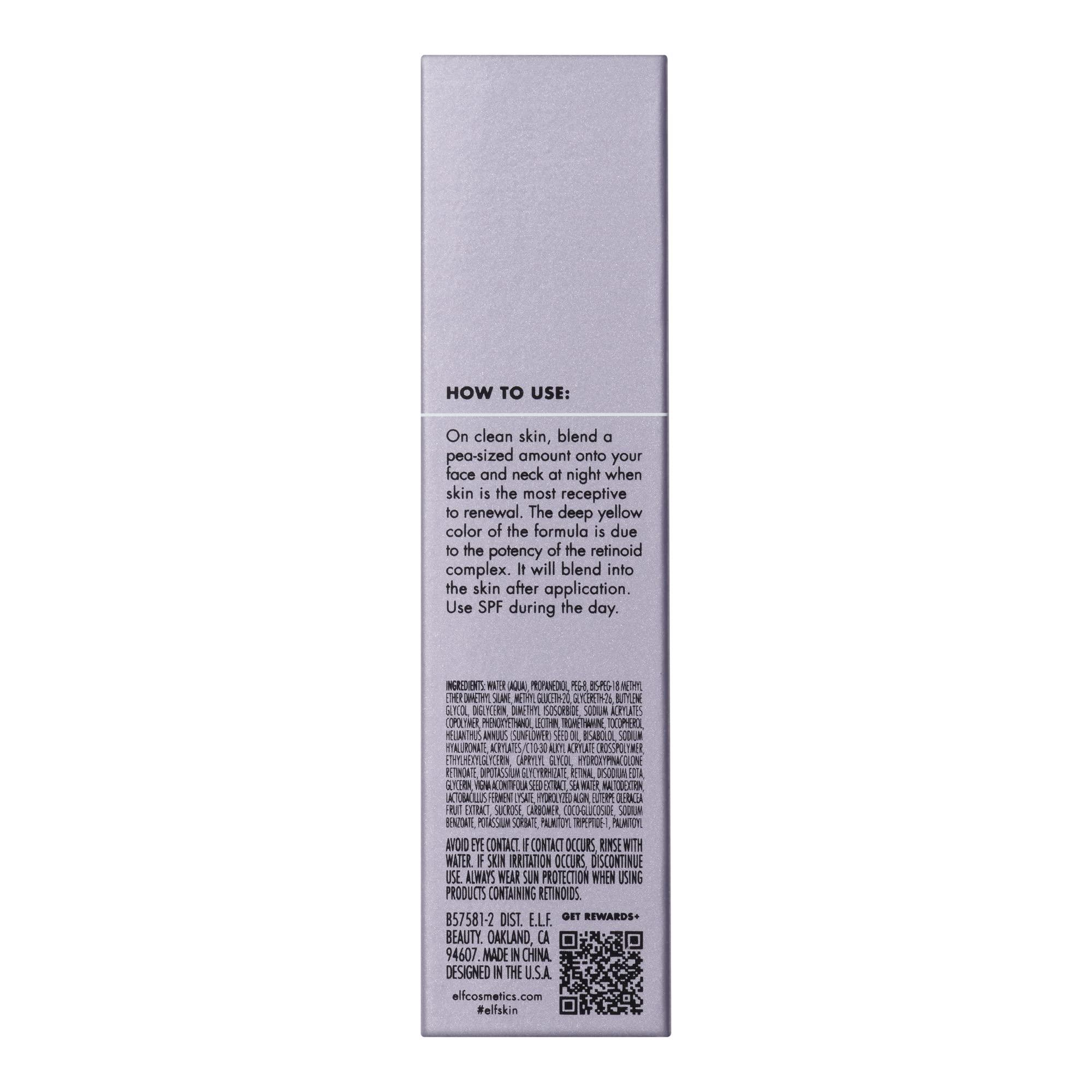 Introducing your skins e.l.f.ing game changer. The most powerful retinoid you can get without a script reduces the appearance of fine lines and wrinkles over time to reveal rejuvenated, smooth and radiant skin. The potent formula is also supercharged with hydrating hyaluronic acid and antioxidants to help brighten skin tone.
