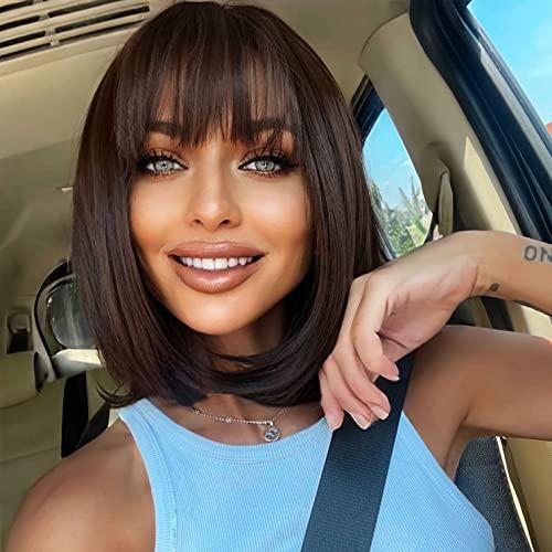 EMMOR Dark Brown Bob Wigs for Women Shoulder Length Synthetic Wig with Fringe Bangs High Heat Resistant Wig(Dark Brown)