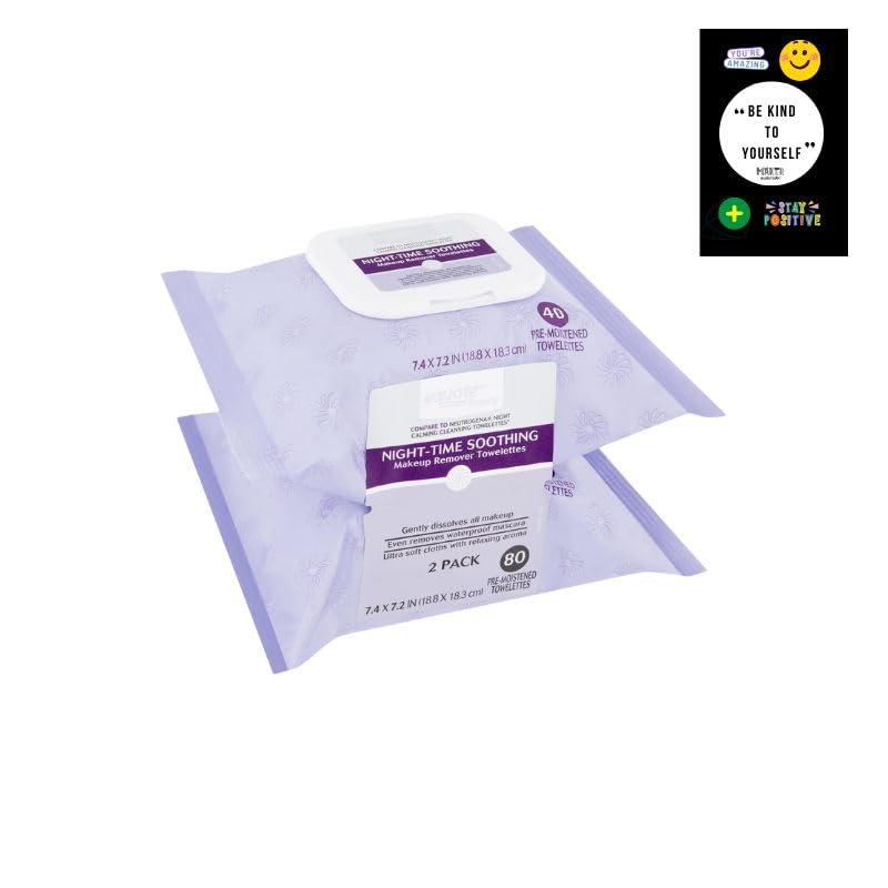 Remove facial impurities with ease with the Equate Beauty Night-Time Soothing Makeup Remover Towelettes. These towelettes clean skin and gently dissolve all makeup, including waterproof mascara. Not only are these wipes dermatologist, ophthalmologist, and allergy tested, they are also hypoallergenic, alcohol free, and safe to use around the eye area. The convenient, easy-to-carry package fits perfectly into purses, backpacks, and gym bags, so you can keep it with you day and night. The two-pack bundle contains 160 pre-moistened wipes, 80 in each pack. Have beautiful and clean skin no matter where you are with the Equate Beauty Night-Time Soothing Makeup Remover Towelettes! Equate Beauty understands that beauty isn't just skin deep. With a large selection of the latest beauty products Equate Beauty helps you be your best you.