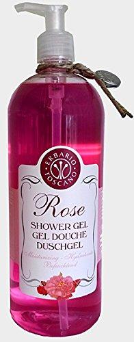 Erbario Toscano Rose Shower Gel Soap 33.81 Fl.Oz. From Italy. Extra large herbal Italian rose shower gel soap containing pure rose extract in a pump bottle with the Erbario Toscano gold seal attached with rustic rope tied around neck of the bottle. Will leave your skin soft, supple and smelling great.