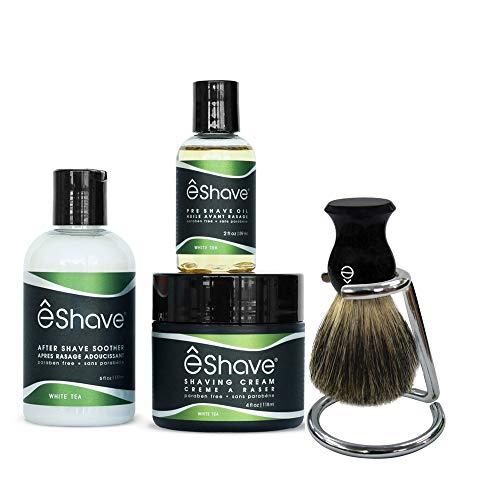 Men's Health Magazine Grooming Awards voted eShave BEST Post Shave Lotion, BEST Pre Shave Oil, and BEST Shave Cream. All eShave shaving kit products are Paraben Free, Sulfate Free and Vegan. They contain NO SLS, NO SLES and NO synthetic colors. eShave Shaving Kit for Men has all the best of the best to deliver a pain free shave with no razor burn, no ingrown hair and no 5 oclock shadow, no kidding! Pre Shave Oil prepares skin and hair for shaving, Shaving Cream generates a rich lather for a close and comfortable shave, Shaving Brush lathers up shaving cream, opens up pores, raises and softens the hair for a perfect shave and After Shave Soother moisturizes skin after shaving. So that you feel good and look good