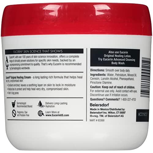 Seals in moisture to protect and heal very dry, compromised skin Relieves dry skin associated with eczema, psoriasis, or drying medications Free of fragrances and dyes, wont clog pores Provides 24-hour moisture Product info Eucerin Original Healing Cream is a time-tested formula that helps heal and protect extremely dry, sensitive and compromised skin. This thick, rich body cream for dry skin provides intensive moisture for the skin. Eucerin Original Healing Cream binds water to the skin to provide effective moisturization, and this skin cream for dry skin helps prevent moisture loss by replenishing the skins moisture barrier. This Eucerin cream is fragrance free, dye free, and non-comedogenic, and is gentle enough for use as a daily dry skin body cream. This Eucerin moisturizing cream is perfect for use as a very dry skin cream, and can also be used as a hand cream or foot cream. To use, smooth this Eucerin dry skin cream onto your skin daily. Eucerin is a dermatologist-recommended skincare brand that is based on an uncompromising approach to science. How To Use Smooth over body daily. Caution: Keep out of reach of children. For external use only. Avoid contact with eyes Discontinue use if irritation occurs. Ingredients All Ingredients Aqua, Petrolatum, Mineral Oil, Ceresin, Lanolin Alcohol, Phenoxyethanol, Piroctone Olamine