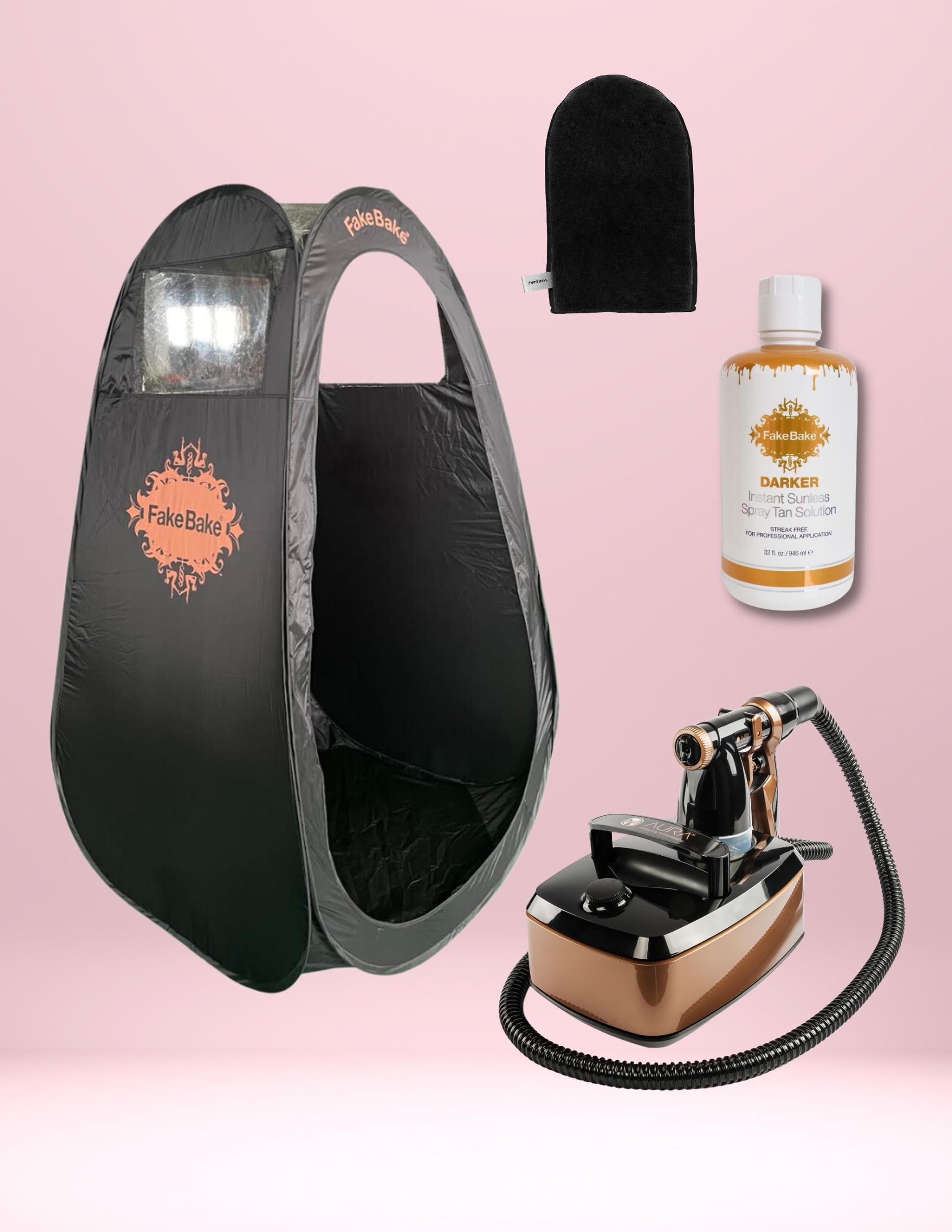 Fake Bake's Basic Spray Tan Equipment Package! You get all of this! 1 - Allure Xena Spray Tan Equipment 1 - Fake Bake Pop Up Tanning Tent 1 - Bottle 32oz Darker Spray Tan Solution 1 - Deluxe Application Mitt