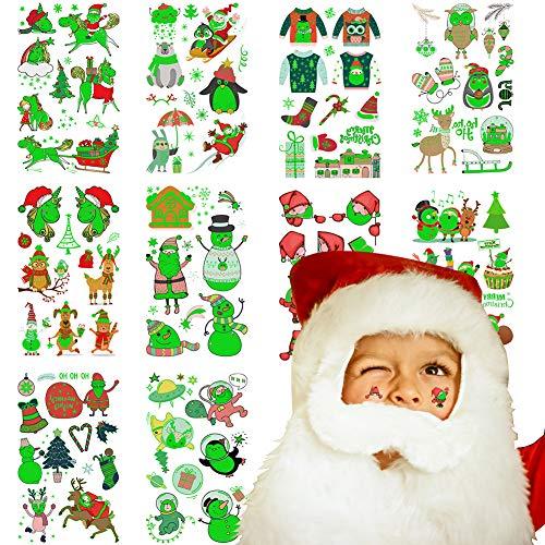 - Popular with Kids - These cute Christmas tattoos can glow in the dark, featuring as Santa Claus, Christmas tree, socks,reindeer, feather, jing-o-bell, snowman, gift, sweater etc. Kids at all ages would love them.Perfect birthday party favors, Halloween gifts, school rewards for kids.