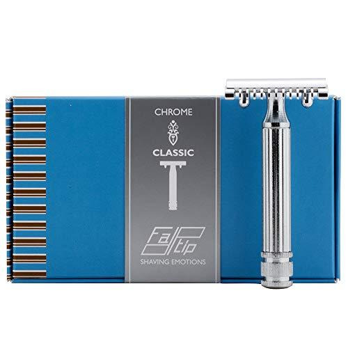 42107 FATIP GRANDE CHROME SAFETY RAZOR Weight: 66 g / Total length - 87 mm / Handle lenght - 78 mm / head Width - 42 mm. Chrome Classic Original is a 3 pieces safety razor marked with the classic handle ionic column design interrupted by elegant knurled base, that facilitates the screw opening of the head. It's totally made of brass and then subjected to metallic finishing process. The razor is perfectly balanced and easy to use. The open comb head ensures the correct work of the shaver with different lengths of beard growth and a very accurate and deep shaving. Fatip Classic is one of the most internationally known razors becoming a real classic vintage shaving. FATIP SAFETY RAZOR MADE IN ITALY. This razors are totally made in Italy. The brass is the metal used which is worked, by artisans of Premana, first in the form and then plated in the various finishes. STEP 1. The head is mounted by unscrewing the handle and lifting the cover STEP 2. The new blade places under the cover. STEP 3. The handle is screwed and squeezed, so you're ready for the shaving. FATIP. TO EVERYONE HIS HEAD. The razors are recognizable thanks to the particular original open comb head that ensures a perfect and deep shaving for every type of beard. Today Fatip razor has the version with Gentile closed comb head too, for a delicate and easy shaving. Open comb head. It was introduced at the beginning of '900 on the first safety razors, with the aim of making accessible the shaving of large moustaches and sideburns that were fashionable at the time. Fatip razor is popular for his head with 11 thin teeth comb, and for this reason we've called it: the Original. Open comb head shaves deeply because the skin tends less and the hair, slipping between the comb "teeth", is closest to the blade. The shaver must be placed on the face ,not pressing, but by sliding. The Original guarantees a deep and accurate shaving for every type of beard (close shave), ideal for men with hard and thick hairs. We recommend the use of a softer blade (mild) between those on the marketplace, combination with a good pre-shave oil or cream that prepares the skin, facilitates the sliding and softens the hair. Closed comb head Gentile. Fatip GENTILE presents the characteristic closed bar and it's equipped with 9 slightly larger teeth compared to those of Original head. In the case of GENTILE, the hair is combed and the bar tends the skin, but it prevents the blades sink into it too. The shaving will be less aggressive and easier. The Kind is indicated for a daily shaving and for sensitive skins. Recommended also to safety razor followers. Given the less aggressiveness, in certain areas of the face it may require more steps or more pressure, but it always ensures a wonderful and safe shaving. The utilizer can also try more or less sharpened blades according to their needs. INDICATIONS. Fatip razor is indicated for every type of skins, particularly for the deep shaving lovers. TIPS. Use a pre-shaving product, fine shaving cream or foam. ADVICES. A softening and warm shower before shaving to reduce abrasions and small cuts. FATIP'S STORY. 1950- Shaving's art born in Milan. Fatip razor is created in the years of Milanese Boom, the years of reconstruction and rebirth. A period in which the man, his style and his rites, come back to be dominant in a new society and enthusiastic. In the '80s razor's production moves to Premana (Como), which today is still the epicentre of Italian craftsmanship, a cult place in which all cutting handmade objects are considered unique and distinctive. Now razor's production known as Fatip was born at the beginning of the '50. Immediately the razor became extremely popular for its design and the special process. '80. Ilario Fazzini, skilled craftsman of Premana, introduced FATIP brand, maintaining the original aesthetic characters and at the same time by placing innovative processes to increase quality and performance. Today Fatip razor is used and appreciated all over the world for its style, the handling and the safety of the cut. A "cult" tool, worthy representative of Italian art of shaving. "Premana is a village of artisans located at 1000 meters above Como Lake. Renowned production district for the highest quality content processing for: professional knives, scissors and cutting tools ". Fatip razors are ambassadors to the world of "shaving pleasure" and among the best exponents of Italian artisan culture . . . the real one, handed down from father to son.
