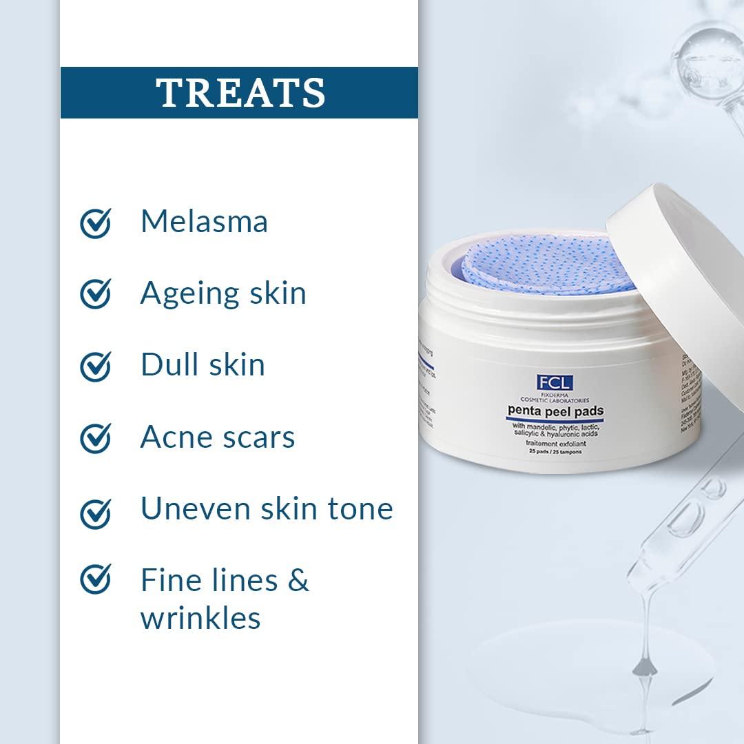 Penta peel pads is an innovative refining peel treatment which gently removes the dead cells and promotes healthy cellular turnover to smooth texture and reduce the appearance of fine lines and wrinkles. The single use pads can be easily used at home. It is formulated with five different types of acids, FCL Penta peel pads gently remove dead cells and promotes healthy cellular turnover to smoothen texture and reduce the appearance of fine lines and wrinkles.Exfoliation plays an important role in skin care regimen. It helps in unclogging the pores, peeling of the dead skin cells, boosts the circulation in the skin, even outs the skin and helps other skin care ingredients to penetrate better. Chemical peel or acid peel is an integral part for ageing factors, melasma skin regimen. To make the peeling process mild, safe and easy, FCL has introduced the concept of peeling pads, which is a home care product to fulfil the exfoliant needs of the skin. The wipes are soaked in a cocktail of various hydroxy acids like mandelic acid, salicylic acid, lactic acid, multifruit AHAs. It helps to keep the skin moisturized and feeling less dry. When you use it regularly, it can also improve signs of ageing. It stimulates collagen renewal and can firm your skin.