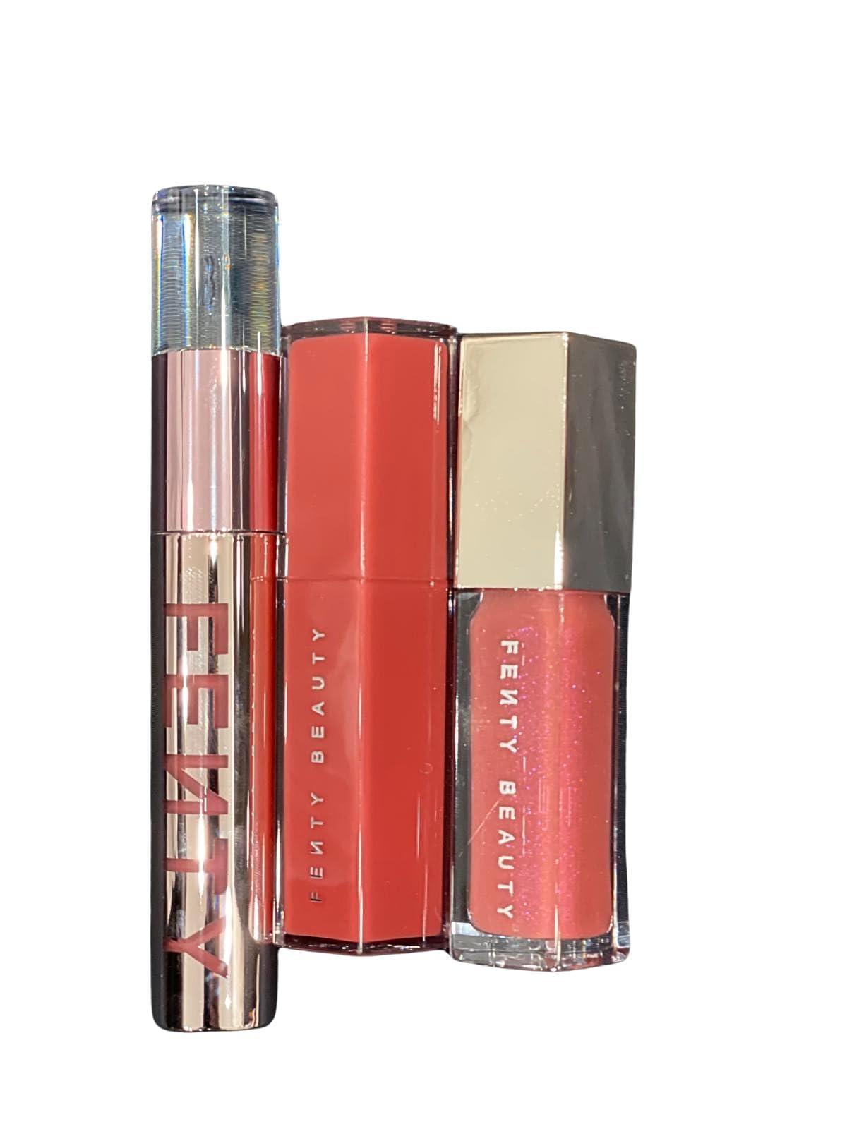 Mauve Nude Trio Set: Discover the ultimate lip set featuring three must-have products in a stunning mauve nude shade. Perfect for any occasion, this limited-edition set includes: Gloss Bomb Universal Lip Luminizer (0.3 oz/ 9 mL - Riri): Wear it alone or layer over lipstick for a glossy finish. Fenty Icon Velvet Liquid Lipstick (0.19 oz/ 5.6 mL - Riri): Achieve iconic lips with a gentle swipe for a velvety look. Gloss Bomb Stix High-Shine Gloss Stick (0.12 oz/ 3.6 g - Riri): For a high-shine gloss, use a tapping motion for a sheer wash of color or a swiping motion for fuller coverage. Ingredient Callouts: These products are cruelty-free. What Else You Need to Know: This bestselling trio, featuring Rihanna's iconic rose-mauve shade, is perfect for the holidays. Ensure your lips pop with this versatile and limited-edition set, sourced from trusted suppliers. Pro Tips: Try Gloss Bomb over your favorite lip color for super-lustrous dimension. Prep lips with Pro Kissr Scrubstick (sold separately) before applying the Fenty Icon Velvet Liquid Lipstick. Make your lips shine with this fabulous trio!