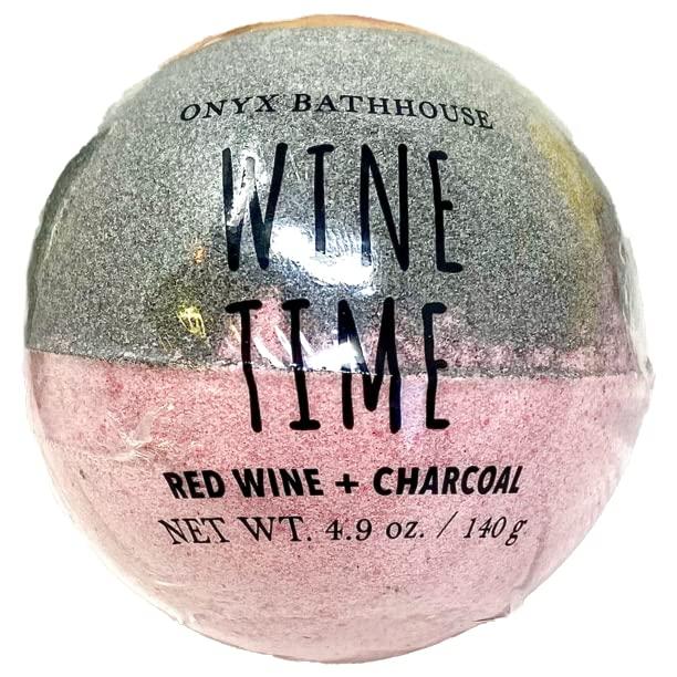 Onyx Bathhouse "Wine Time" Bath Bomb is made with red wine and charcoal. Charcoal is known for balancing the body's natural oils, while the red wine is known for benefits such as stamina and longevity for the skin. 4.9 ounce bath bomb Fizzes and twirls in the water Gentle enough for all skin types Includes charcoal for balancing your body's natural oils Makes a great gift or include in an at-home spa basket