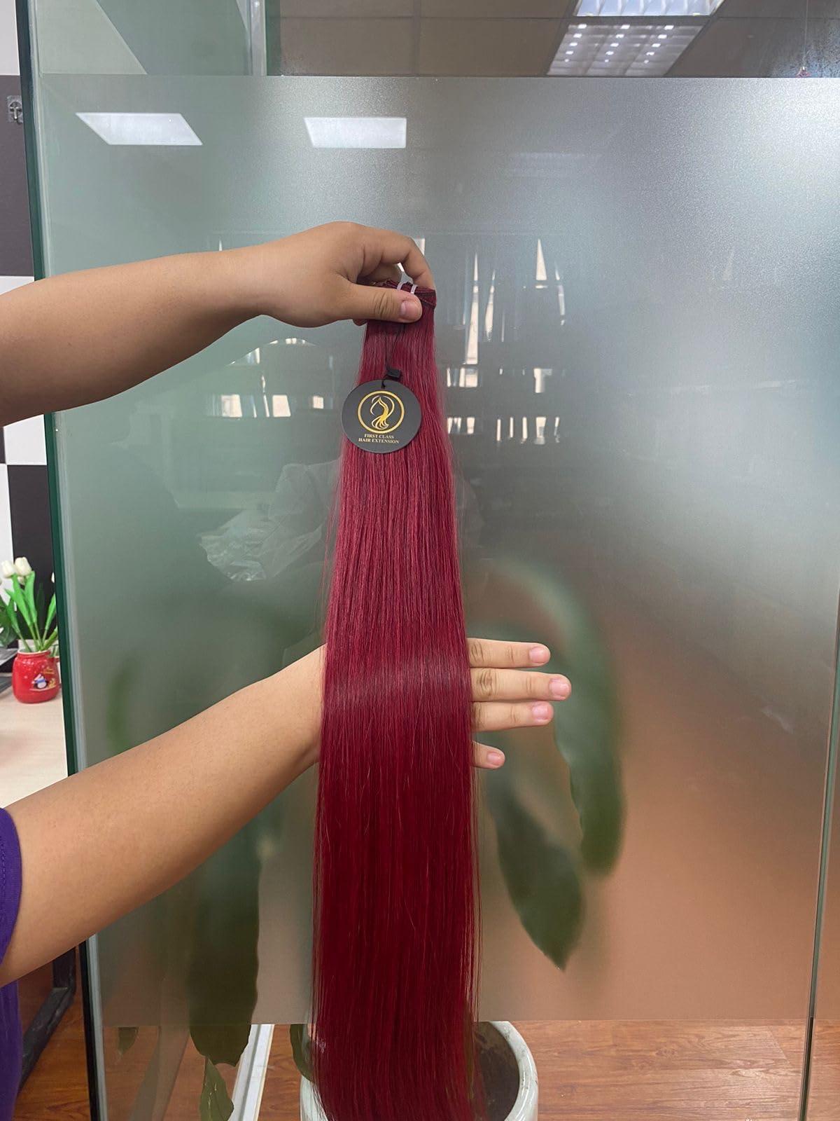 This product is a set of extensions made of 100% human hair that are designed to add length and volume to your hair. The extensions are straight and have a natural look, making them perfect for those who want to add a touch of glamour to their hair. The color of the extensions is red wine, which is a unique and eye-catching color that will make you stand out from the crowd. The texture of the extensions is soft, which means that they are comfortable to wear and do not cause any discomfort or irritation to the scalp. The softness of the extensions also makes them easy to style and maintain, so you can keep them looking great for a long time. One of the benefits of using 100% human hair extensions is that they are more natural-looking and blend in better with your natural hair. This means that you can wear them without anyone noticing that you are wearing extensions. The extensions are also more durable and long-lasting than synthetic hair extensions, so you can enjoy them for a long time. Overall, this set of extensions is a great choice for anyone who wants to add length and volume to their hair without compromising on quality or style. With their natural look, soft texture, and unique red wine color, these extensions are sure to make you look and feel your best.