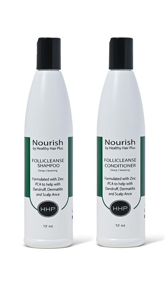 Our Most Effective Shampoo & Conditioner for Product Build-Up, Oily Hair & Scalp, and Dandruff! Follicleanse Shampoo and Conditioner - Now in a New 12 fl oz size - is our best-selling hair products for deep-cleaning you hair and scalp. Natural botanical and plant extracts combined with the proven effectiveness of Zinc and Zinc PCA wash away built-up residue and build-up leaving your hair fresh, clean and full of body. Our shampoo/cleanser is calming on scalp and gentle on your hair while controlling and reducing oiliness, oil secretions, removing flakes, and dramatically reducing inflammation and itching associated with common scalp problems, dandruff, scalp psoriasis or dermatitis. The carefully blended formula is excellent for refreshing your hairstyle after use of styling aids to cleanse sprays, mousse, gels, and creams. It's powerful formula also helps inhiobit DHJT, a leading cause of balding and receding hairlines in men and women. The Follicleanse conditioner gently conditions adding moisture and helping strengthen with proteins, amino acids and panthenol - adding body and bouncy life. Humidity-resistance, it guards against frizz and helps protect from heat damage, UV damage, and chemical and treatment damage.