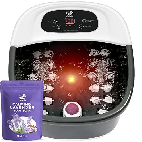 - Fast Heating & Intelligent Temperature Control CANGO Foot Spa Bath Massager with Heat Bubbles and Vibration Massage and Jets can heat up water efficiently and maintain water at selected temperature (95-118F). Its 500W PTC Heater is with safe and secure multi-insulation protection and overheating protection, so you needn\'t worry about the safety. For Home Footbath, soaking feet in CANGO foot bucket can not only enhance the therapeutic effect, but also help relieve fatigue, swelling & redness.