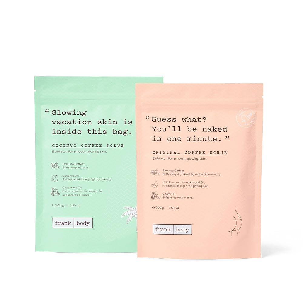 - COCONUT SCRUB: Want vacation-glowing skin? Right this way babe. frank body's Coconut Coffee Scrub is a natural, vegan body scrub here to give you vacation-glowy skin all year round. With a blend of coffee and essential oils, itll work its magic on stretch marks, scars and dry skin to leave you as free as a palm tree.