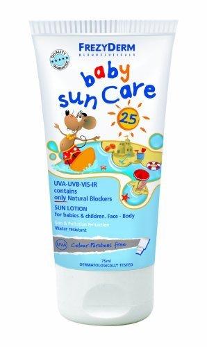 FrezyDerm Baby Sunscreen Lotion - Face & Body SPF25. Ideal for: Babies and toddlers. Atopic dermatitis tendency. Intolerance to chemical filters. Contains only natural sun protection filters! Protection from dehydration and irritation. Contains Vitamin E and Vitamin B5. Without perfume. Parabens free. Colouring free. 75ml