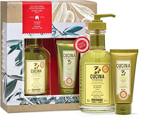Known for its remarkable cosmetic properties, first cold-pressed olive oil is a key ingredient of the Cucina line. The biodegradable* hand soap gently cleanses hands and the nourishing hand butter, enriched with three olive tree extracts, moisturizes and protects them.