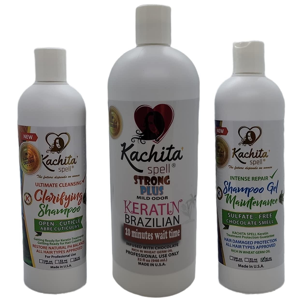 - Kit Includes: NEW Brazilian Keratin Treatment Kachita Spell Chocolate 32 oz, 16oz (500ml) Kachita Spell Shampoo Conditioner for Keratin Treatments Sulfate Free, No Salt, No Paraben K-Shield and 16oz Clarifying Shampoo Kachita Spell Innovative Formula