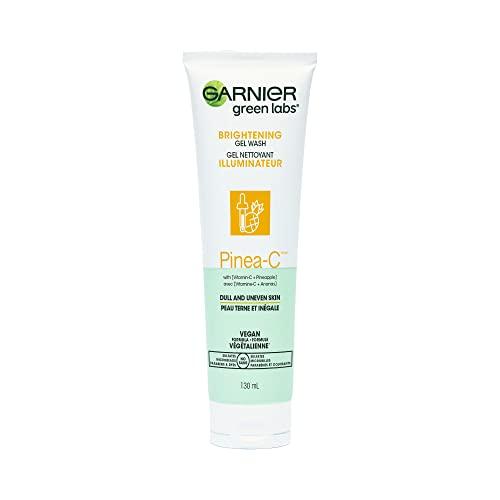 - Garnier Green Labs Pinea-C Brightening Gentle Scrub-Free Wash removes makeup and impurities and smooths skin texture for brighter, glowing skin