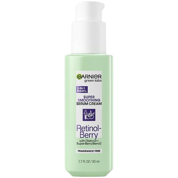Garnier Green Labs Retinol-Berry Super Smoothing Night Serum Cream is 3 products in 1 bottle: the 24 hour moisture of a night cream, the power of a line smoothing retinol serum, and rejuvenation of an eye cream all in one fast-absorbing formula. This formula, with Pure Retinol and a Super Berry Blend, works to improve fine lines and uneven texture for smoother and healthier-looking skin. Fine lines are visibly reduced starting in just 1 week. Under eye skin appears well-rested and dark circles are visibly reduced in 1 week. Great for first-time retinol-users. This non-comedogenic retinol moisturizer is suitable for all skin types and skin tones. This retinol serum cream is allergy tested, dermatologist tested, & ophthalmologist tested for safety, suitable for sensitive skin. Vegan formula, approved by Cruelty Free International, no added fragrance, mineral oils, parabens, or dyes. In just 1 step, this serum cream replaces your daily retinol moisturizer, serum, and eye cream! In the PM, apply all over face. When applying under the eye, gently pat in an outward motion. Do not apply onto eyelids or lips. Avoid eye contact. If contact occurs, rinse thoroughly with water. AQUA / WATER / EAU, GLYCERIN, BUTYLENE GLYCOL, NIACINAMIDE, ISONONYL ISONONANOATE, ALUMINUM STARCH OCTENYLSUCCINATE, CAPRYLIC/CAPRIC TRIGLYCERIDE, GLYCINE SOJA OIL / SOYBEAN OIL, DIMETHICONE, EUTERPE OLERACEA (ACAI) FRUIT EXTRACT, SODIUM POLYACRYLATE, SCHISANDRA CHINENSIS (MAGNOLIA) FRUIT EXTRACT, RETINOL, SODIUM HYALURONATE, PHENOXYETHANOL, CHLORPHENESIN, CAPRYLYL GLYCOL, TRISODIUM ETHYLENEDIAMINE DISUCCINATE, PANTHENOL, PENTAERYTHRITYL TETRA-DI-T-BUTYL HYDROXYHYDROCINNAMATE, MALTODEXTRIN, POLYGLYCERYL-3 METHYLGLUCOSE DISTEARATE, ACRYLATES/BEHENETH-25 METHACRYLATE COPOLYMER