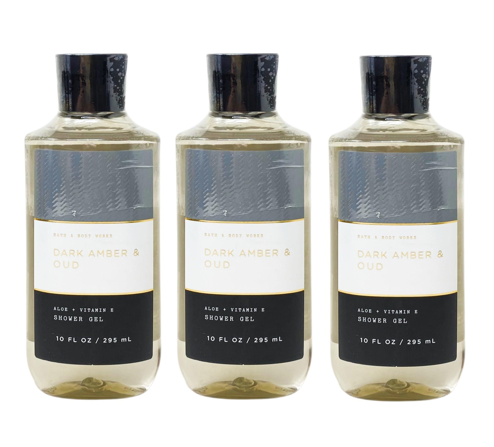 Bath and Body Work Men's Collection DARK AMBER & OUD Shower Gel Bundle. INCLUDES: 3 Aloe + Vitamin E Shower Gels (10 fl oz / 295 mL each). What it smells like: the woodlands after a rainstorm. Fragrances notes: dark golden amber, fresh rainwater and oud wood. What it does: leaves your skin feeling clean and refreshed.
