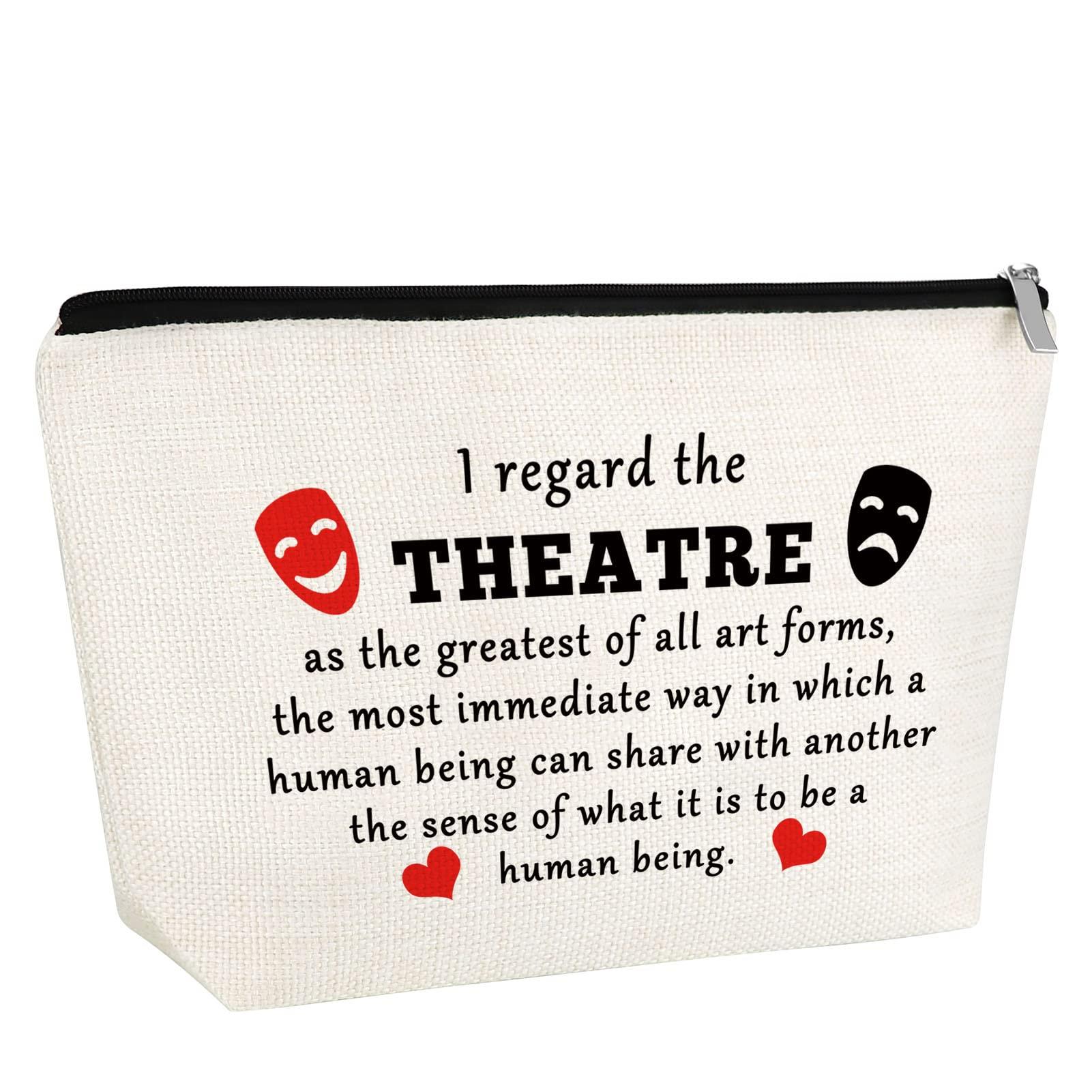 - Musical Theatre Gift for Girls:This drama musical gifts is printed with the famous saying 'I regard the theatre as the greatest of all art forms,the most immediate way in which a human being can share with another the sense of what it is to be a human being.'This theatre makeup bag Designed for drama lovers who like drama. Enter the theater with this drama-inspired cosmetic bag!Special design and print can highlight your personal character and taste easily.
