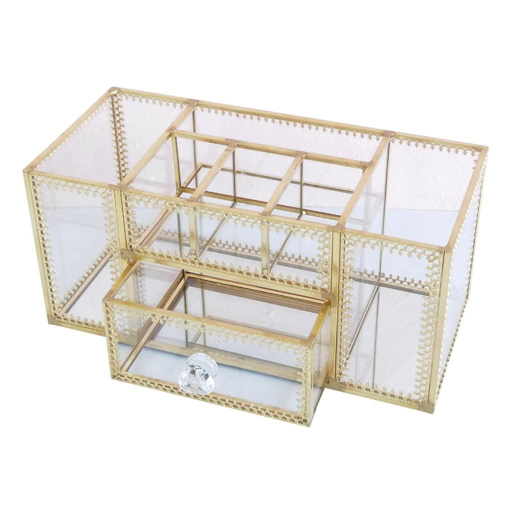 - All jewelry and cosmetics in place.Takes up very little room on your vanity tabletop with 7 grids to separate your makeup brushes from your eyeliners and lip liners pencils.Smoothly Slides Drawer - Completely removable drawers and easy slide out.Organize cluttered drawers and saves space on your vanity tabletop.Manufactured from , clear glass the organizer looks elegant sitting on your vanity, bathroom counter, dresser or anywhere you need it.