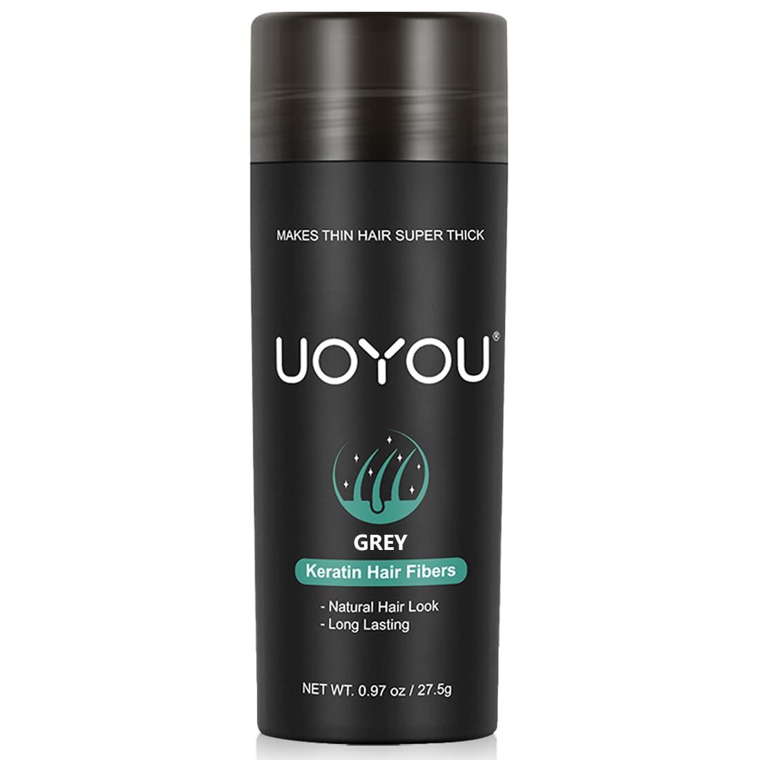 - INSTANT AND EASY HAIR THICKENING WITH UOYOU HAIR FIBERS: The easy and hassle-free solution to thinning hair. Apply the natural keratin hair fibers to the sparse parts of your hair and gently comb through for a seamless finish. The microfibers stay securely in place for a long time, regardless of the weather or your hair type. They are resistant to wind and water, won't stick to clothes or block pores, and easy to clean with shampoo.
