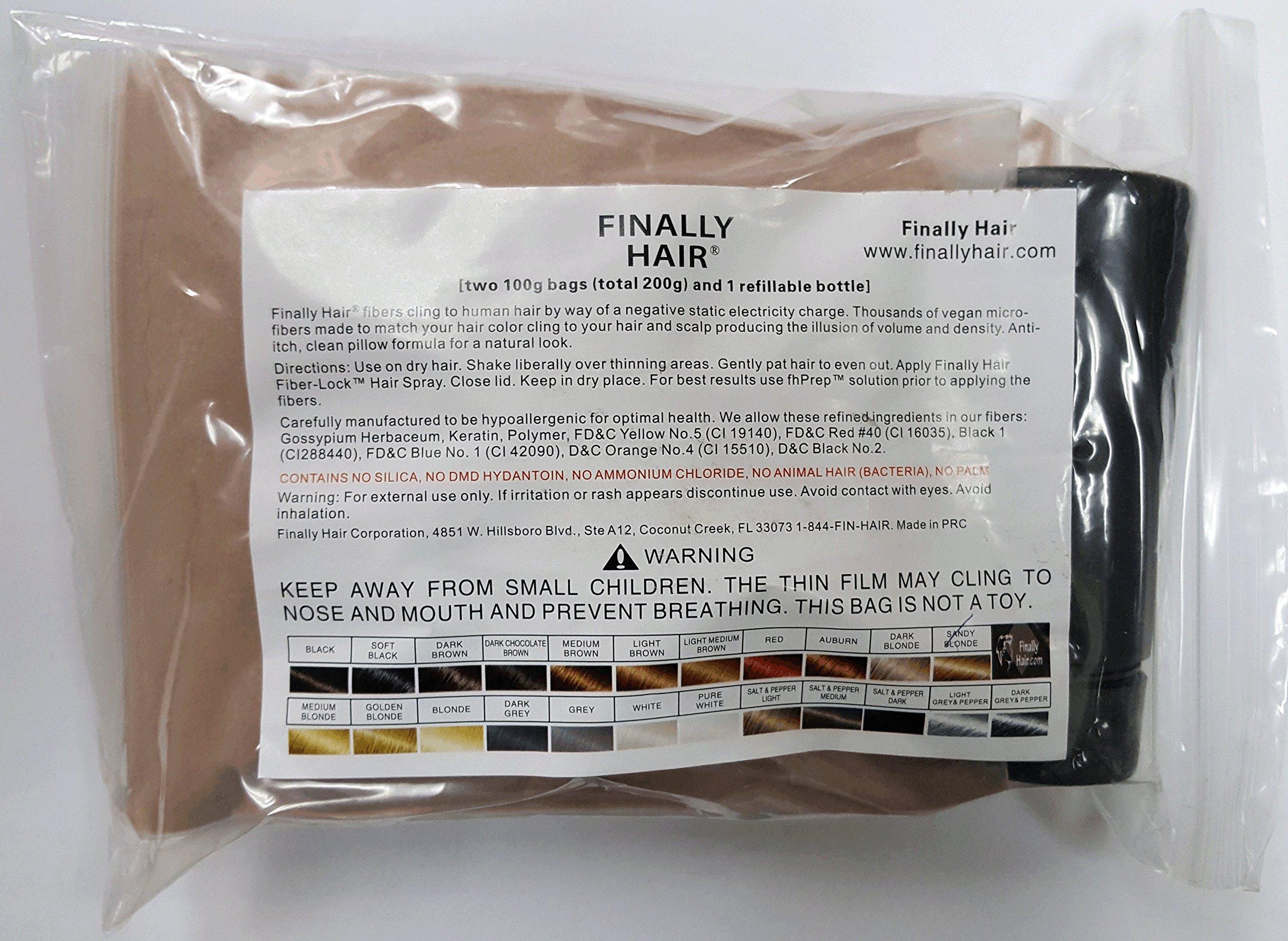 Hair building fibers by Finally Hair. The Best Choice - Includes refillable bottle and 200 Gram (7 ounces) of the highest grade hair fibers available today. Make thin spots disappear within seconds. Instantly conceal hair loss. Thicken your natural hair. Transform your appearance instantly with these remarkable hair building fibers. Perfect for both men and women experiencing thinning hair, these natural-looking fibers seamlessly blend with your existing hair to create the appearance of thick, full locks. The fibers work by adhering to your hair through static electricity, creating natural-looking volume and coverage that stays in place throughout your day. Available in multiple shades to match your natural hair color, these fibers can effectively conceal thinning areas, bald spots, and visible scalp. Easy to apply and remove, they're ideal for daily use and special occasions when you want to look your confident best. The fibers resist wind, rain, and perspiration while remaining undetectable to others. Whether you're looking for a temporary solution to thinning hair or want to enhance your hair's natural volume, these hair building fibers offer a simple yet effective solution for achieving the fuller-looking hair you desire.