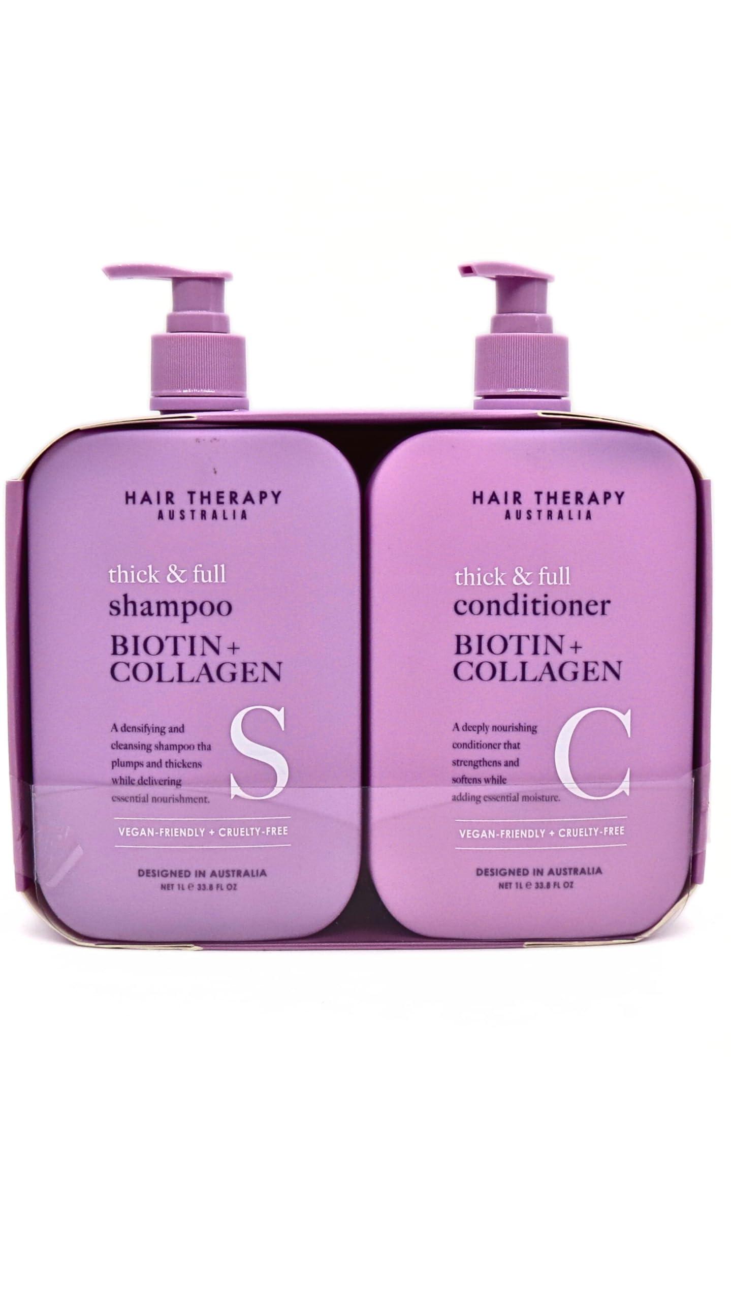 Infused with the power of biotin and collagen, these two powerhouse ingredients work in perfect harmony to transform thin, limp strands into a mane of enviable thickness and fullness. Get ready to say hello to hair that's luxuriously thick, irresistibly full, and undeniably fabulous! The Thick & Full Shampoo starts the transformation process by gently cleansing your hair and scalp, removing build-up and impurities while infusing each strand with the revitalizing benefits of biotin and collagen. Bid farewell to flat, lifeless hair and hello to a foundation of strength and volume! But it doesn't stop there. The Thick & Full Conditioner swoops in to seal the deal, enveloping each strand in a nourishing blend of biotin and collagen that penetrates deep into the hair shaft, plumping up each strand from the inside out. Say goodbye to fine, wispy strands and hello to hair that boasts incredible body and bounce! Experience the transformative power of nature's finest ingredients as they come together to amplify your hair's natural thickness and fullness. Whether you're dealing with genetically thin hair or simply seeking a voluminous boost, the Hair Therapy Thick & Full set is your ticket to hair that commands attention wherever you go.