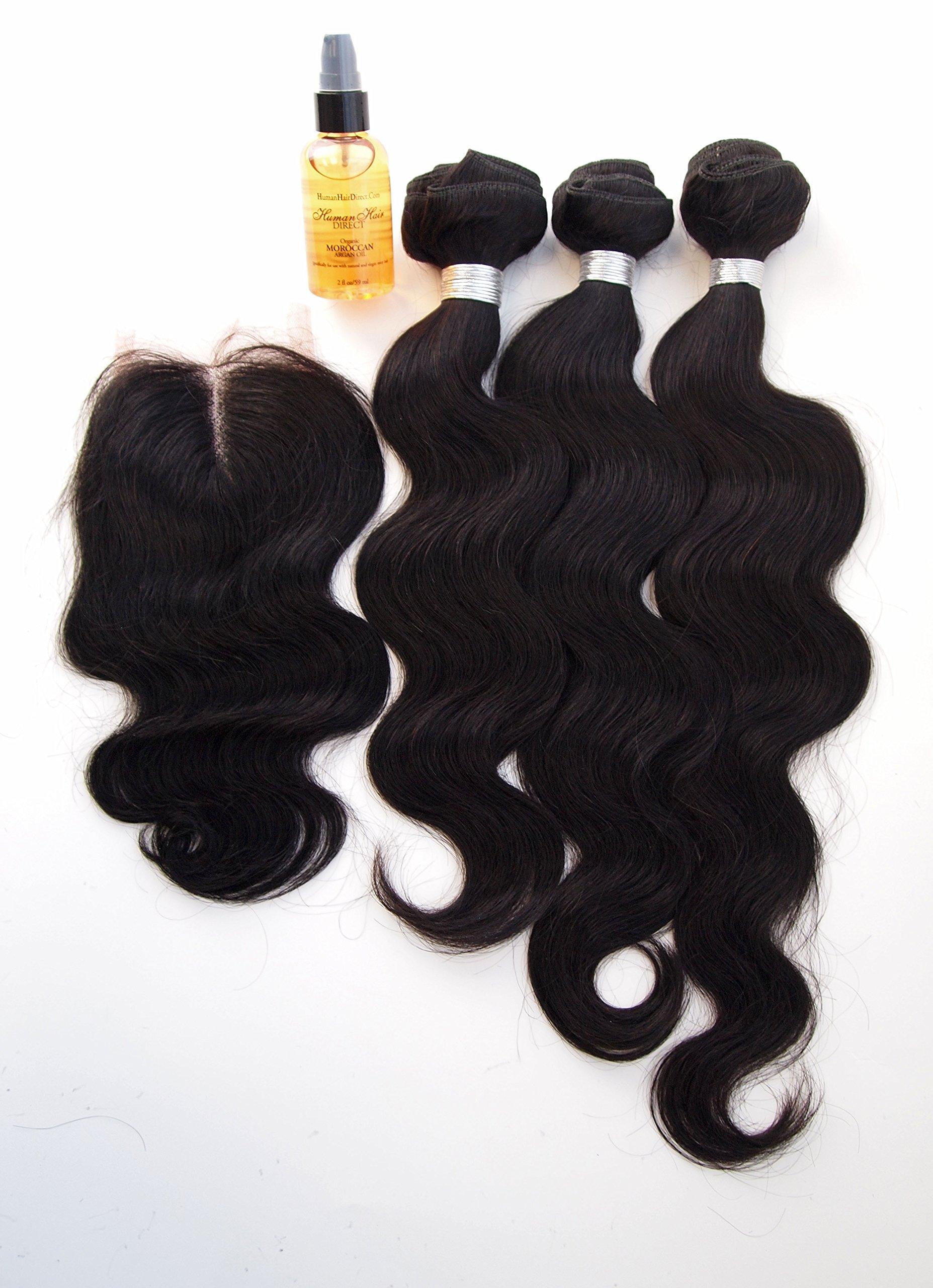 Human Hair Direct BODY WAVE 100% Virgin Brazilian Human Hair Extensions 3-Pack PLUS Lace Closure AND free bottle of Argan Oil! (14\" 16\" 18\" Extensions + 10\"-12\" Lace Closure, #1 - Jet Black (Pre-Colored))