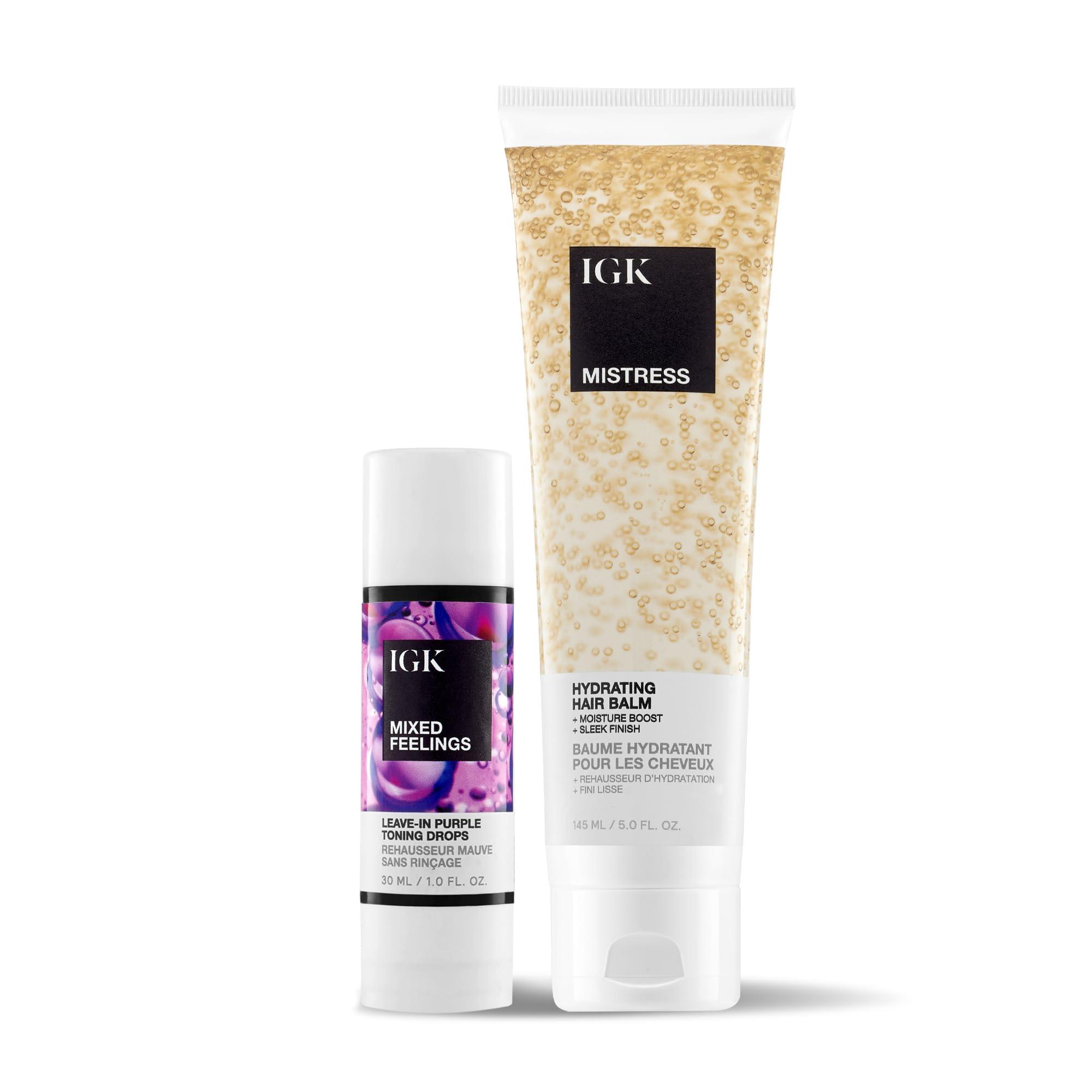 IGK Mixed Feelings is a concentrated purple drops formula that banishes brass and instantly adds tone to blonde, silver or violet hair when added to any styling product, shampoo or conditioner. MISTRESS completes the routine by offering a hydrating hair balm, designed to leave your hair hydrated, lightweight and with extra shine.