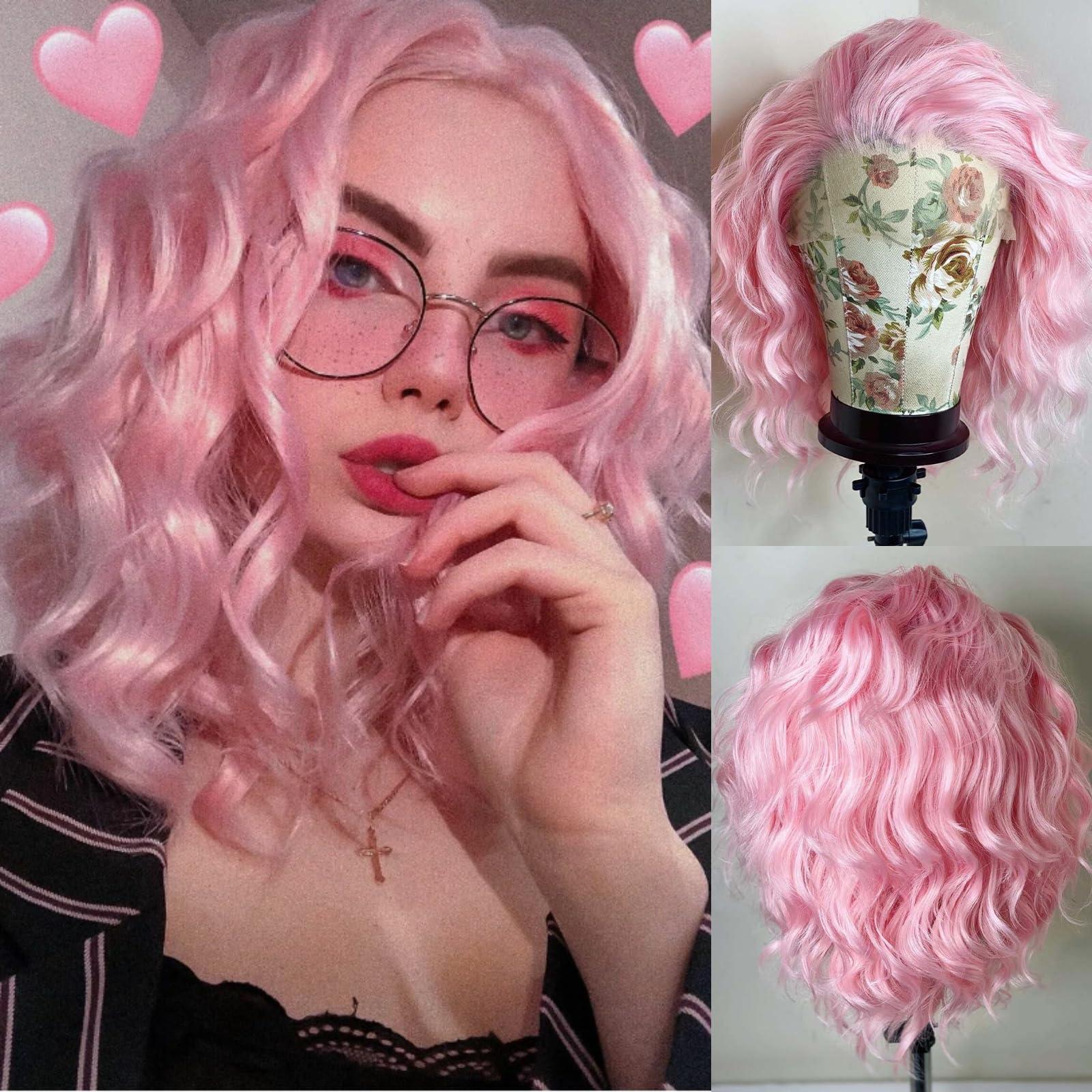 - 1.Imeya Synthetic Pastel Pink Lace Front Wig With Free Part Pre plucked Natural Hairline, Short Curly Wavy Texture.