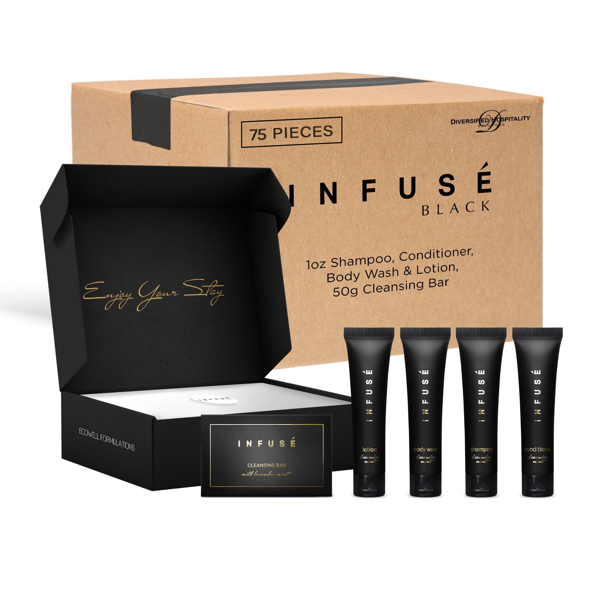 - WHY CHOOSE INFUSE BLACK? Our high-end formula & environmentally friendly beautiful design bring elegance to any upscale rental or vacation property. Our travel size, pump, and gallon toiletries are paraben-free, gluten-free & made with lavender mint for soft skin & hair! We offer a range of products and cater to all your on-the-go personal care needs.