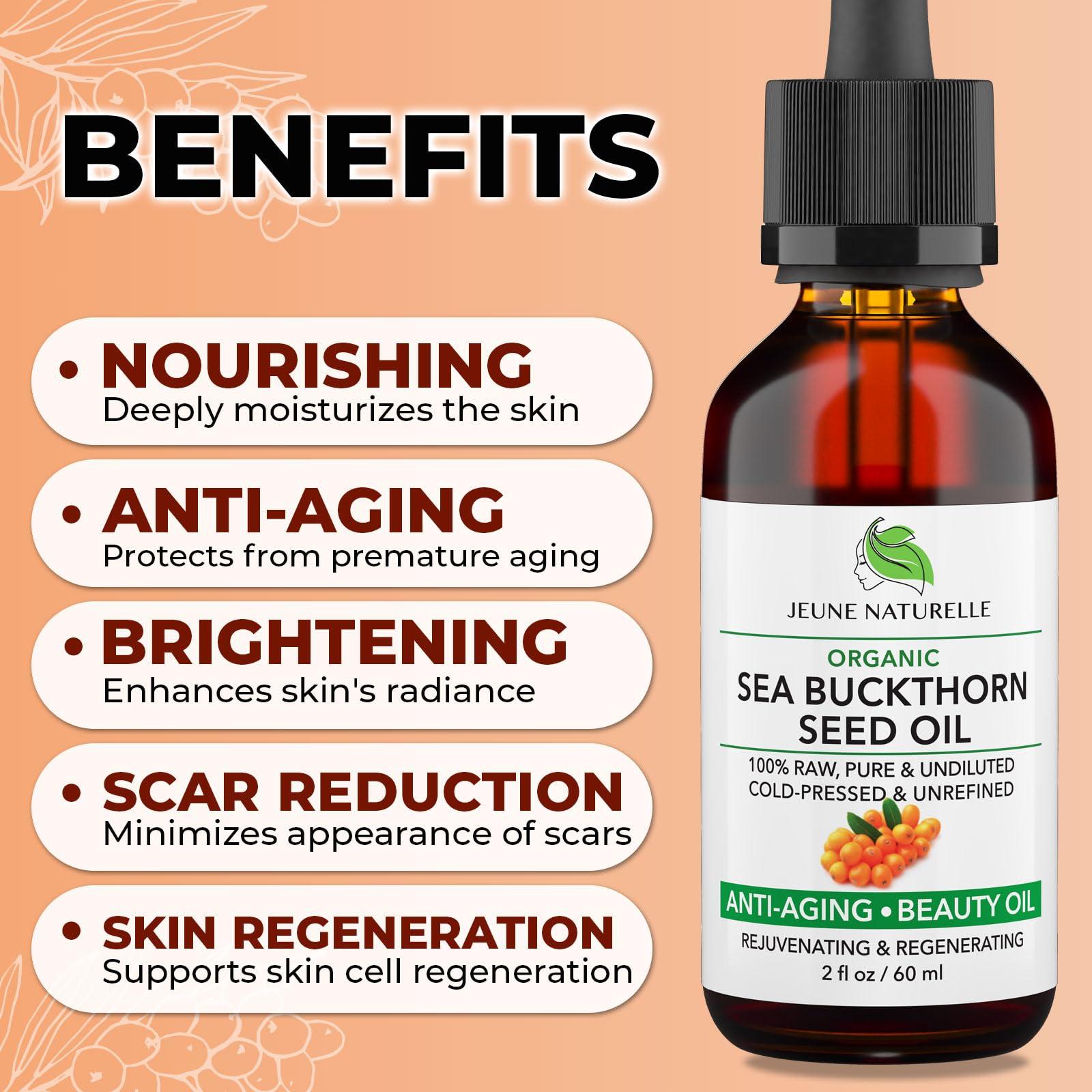 - [GLOWING SKIN]: Sea buckthorn oil is brilliant for skin rejuvenation and regeneration. It contains omega 3, 6, 7 and 9 in a perfect ratio. It's rich in vitamin C , known as the beauty vitamin